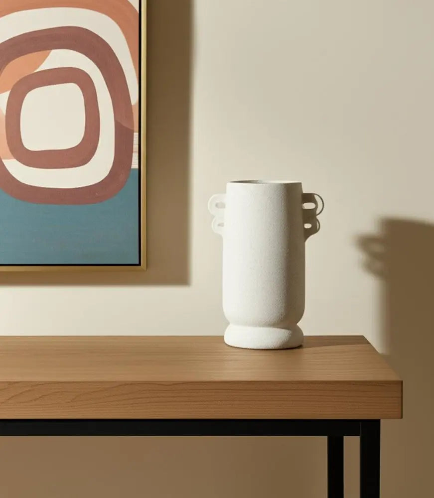 Jarrón de mesa cilíndrico de cerámica color blanco roto de 25 cm con asas