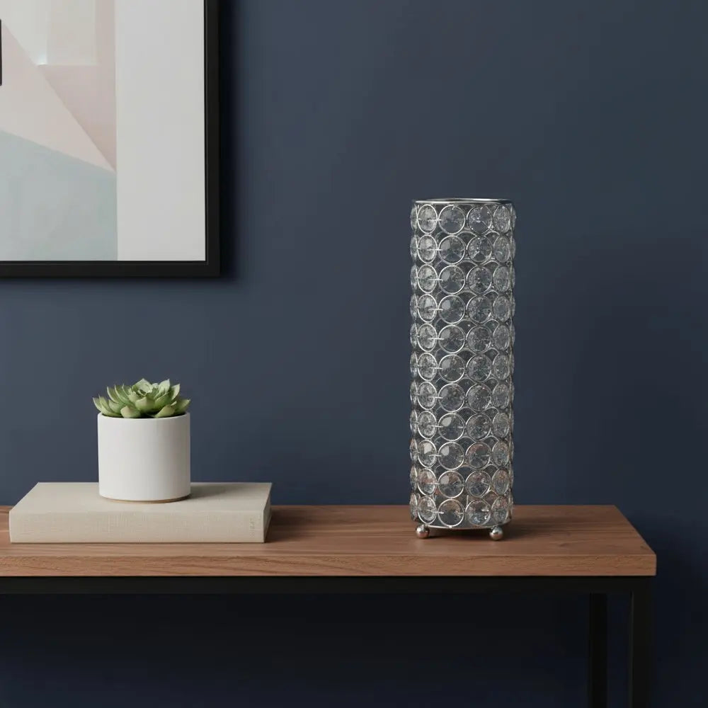 Jarrón de mesa cilíndrico de 10" de cristal transparente y plateado con cristales