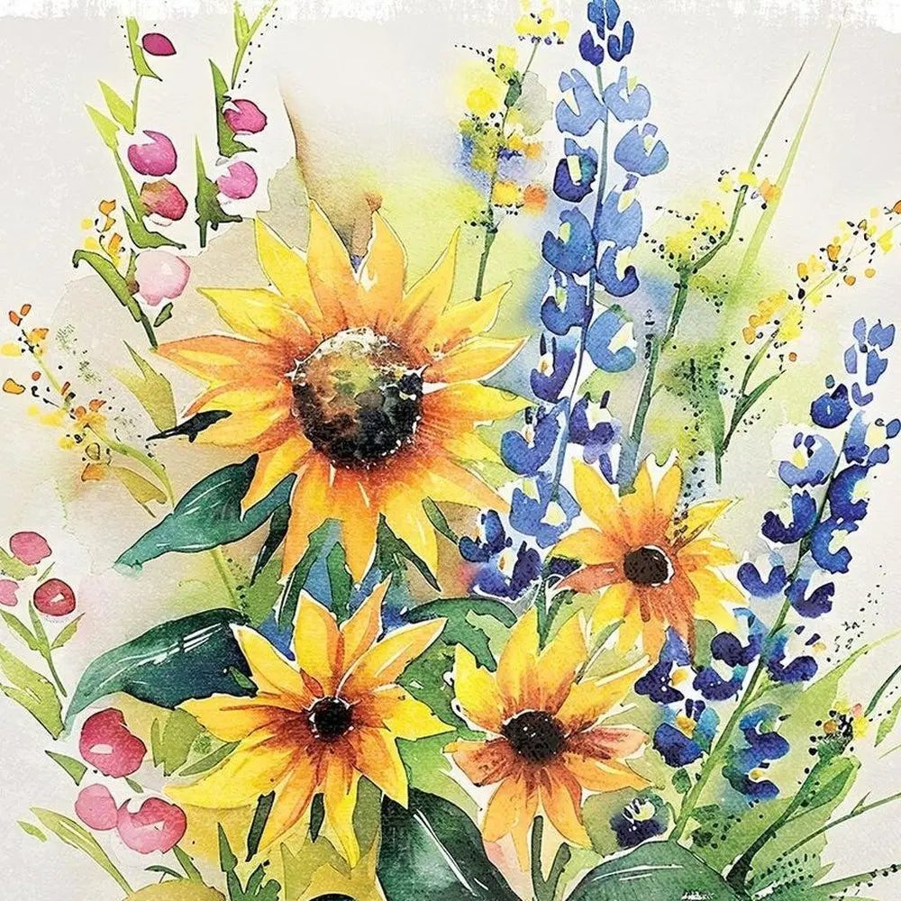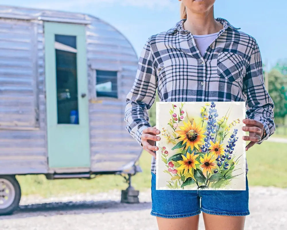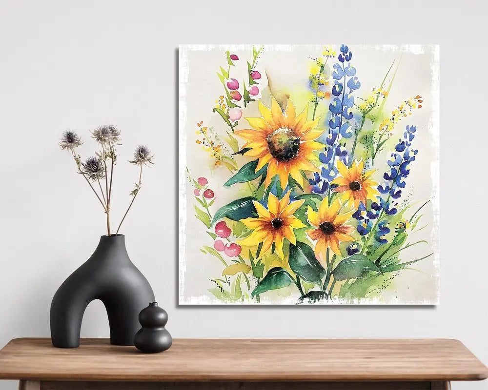 Lienzo cuadrado con flores blancas, amarillas y azules de 30 x 30 cm para colgar en la pared