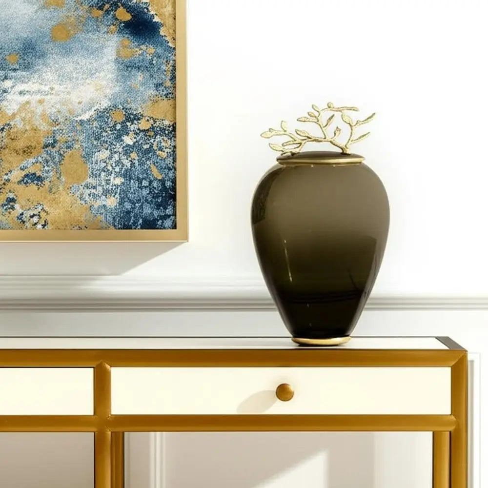 Tarro redondo de jengibre de 14" de vidrio y metal, color verde oscuro y dorado