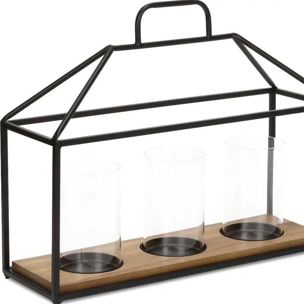 Candelabro geométrico de tres luces de metal negro, vidrio y madera, de 15"