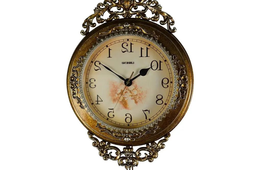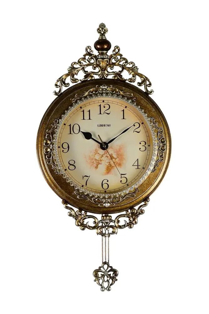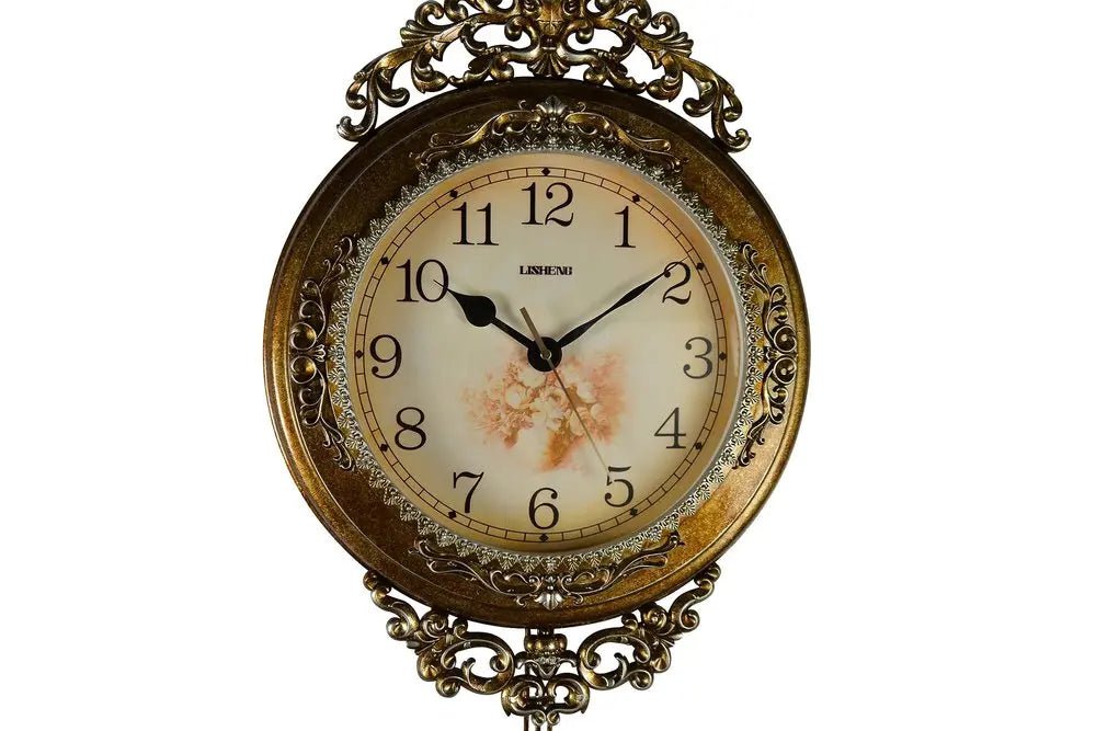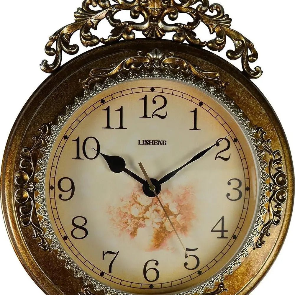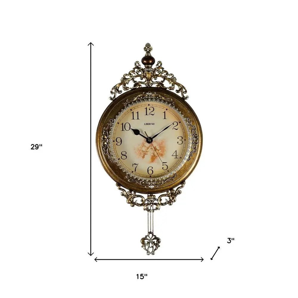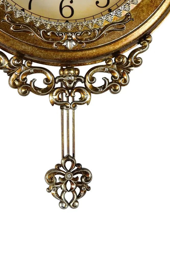 Reloj de pared redondo, ornamentado, de resina dorada y plateada, con péndulo silencioso, de 15"