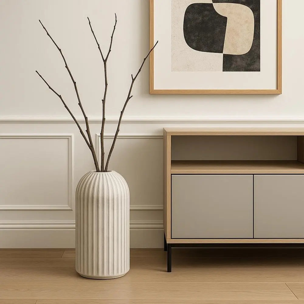 Jarrón de piso de cerámica cilíndrico de 16" con rayas grises y blancas