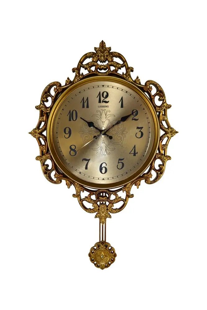 Reloj de pared redondo, ornamentado, de resina dorada y negra, de 17" y péndulo silencioso