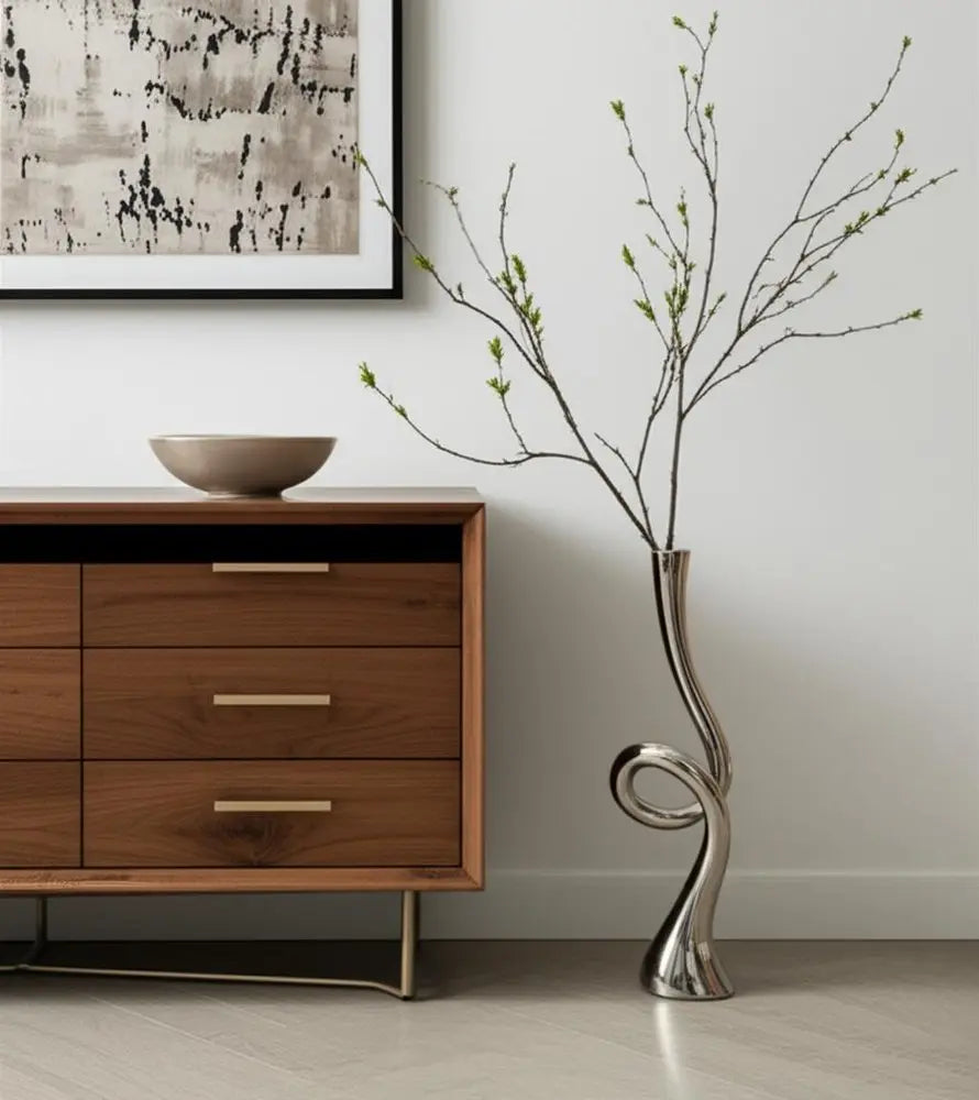 Jarrón de piso de aluminio con forma de trompeta plateada de 39"