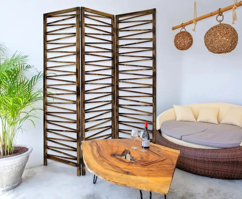 Biombo divisor de ambientes de tres paneles de madera con diseño rústico geométrico