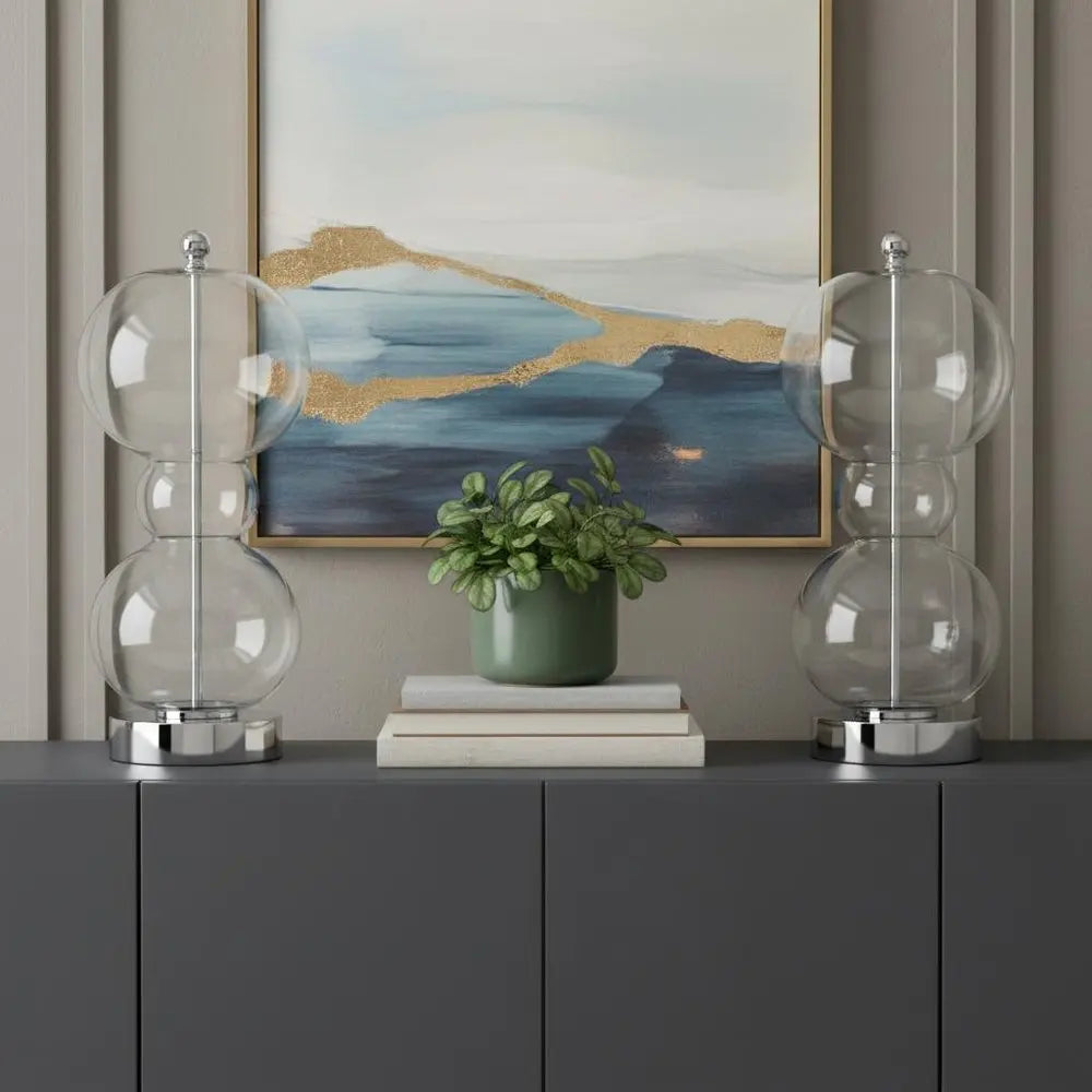 Añada elegancia y frescura a su espacio con este juego de dos lámparas de mesa de alta calidad de 56 cm, de calabaza plateada, con pantallas de tambor. La base es de hierro con acabado plateado. La pantalla blanca, de lino, tiene forma de tambor. Esta lámpara de mesa estándar está diseñada para proporcionar iluminación general. Su diseño de alta calidad la convierte en una lámpara ideal no solo para iluminar, sino también para realzar una habitación con estilo. La lámpara perfecta para crear la luz natural y relajante perfecta en su espacio. 56 cm de alto x 23 cm de ancho x 23 cm de profundidad.