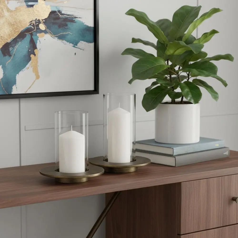 Juego de dos candelabros de mesa de metal con diseño geométrico envejecido dorado.