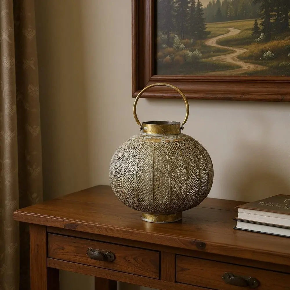 12" Bronze And Green Distressed Lattice Metal Tabletop Lantern Candle Holder
