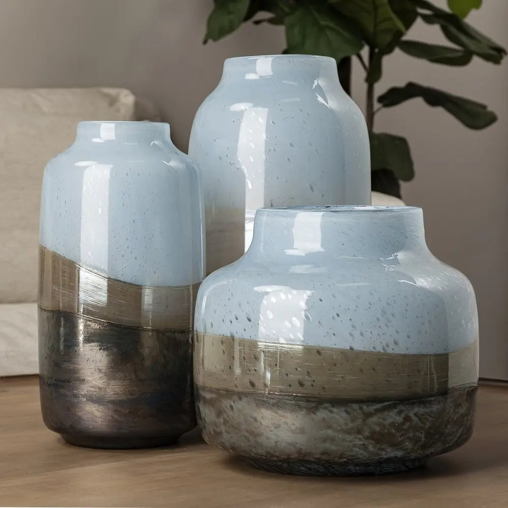 15" Blue And Beige Abstract Cylinder Crystal Glass Table Vase