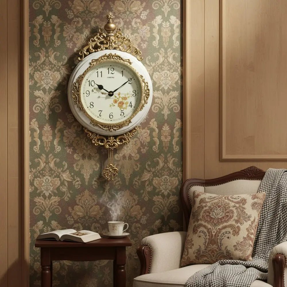 15" Ivory And Gold Resin Silent Pendulum Ornate Round Wall Clock
