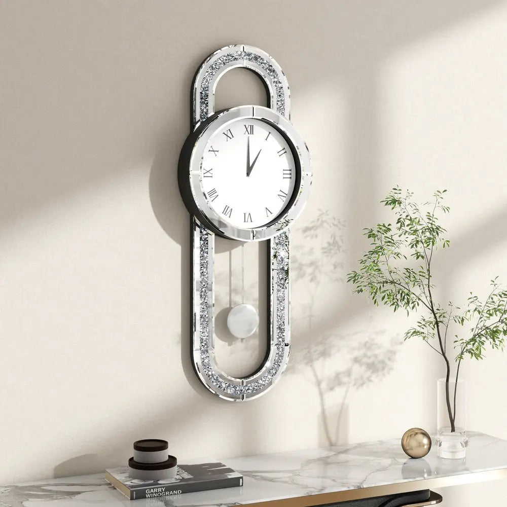 15" Silver Faux Crystal And Mirrored Glass Silent Analog Oval Wall Clock