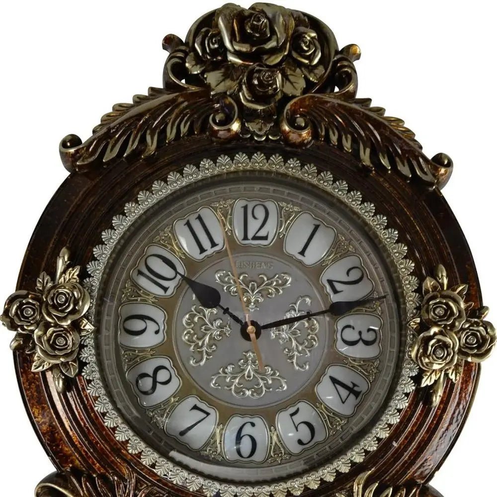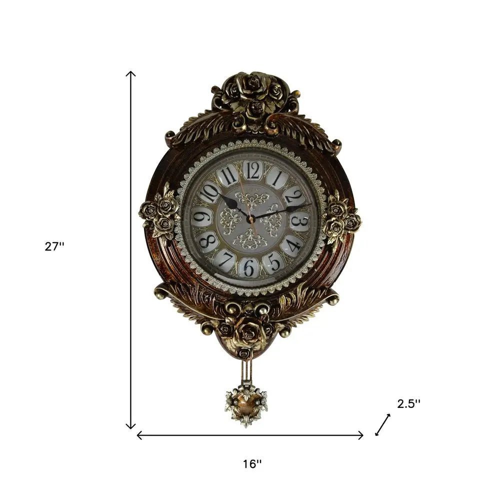16" Brown And Silver Resin Silent Pendulum Ornate Oval Wall Clock