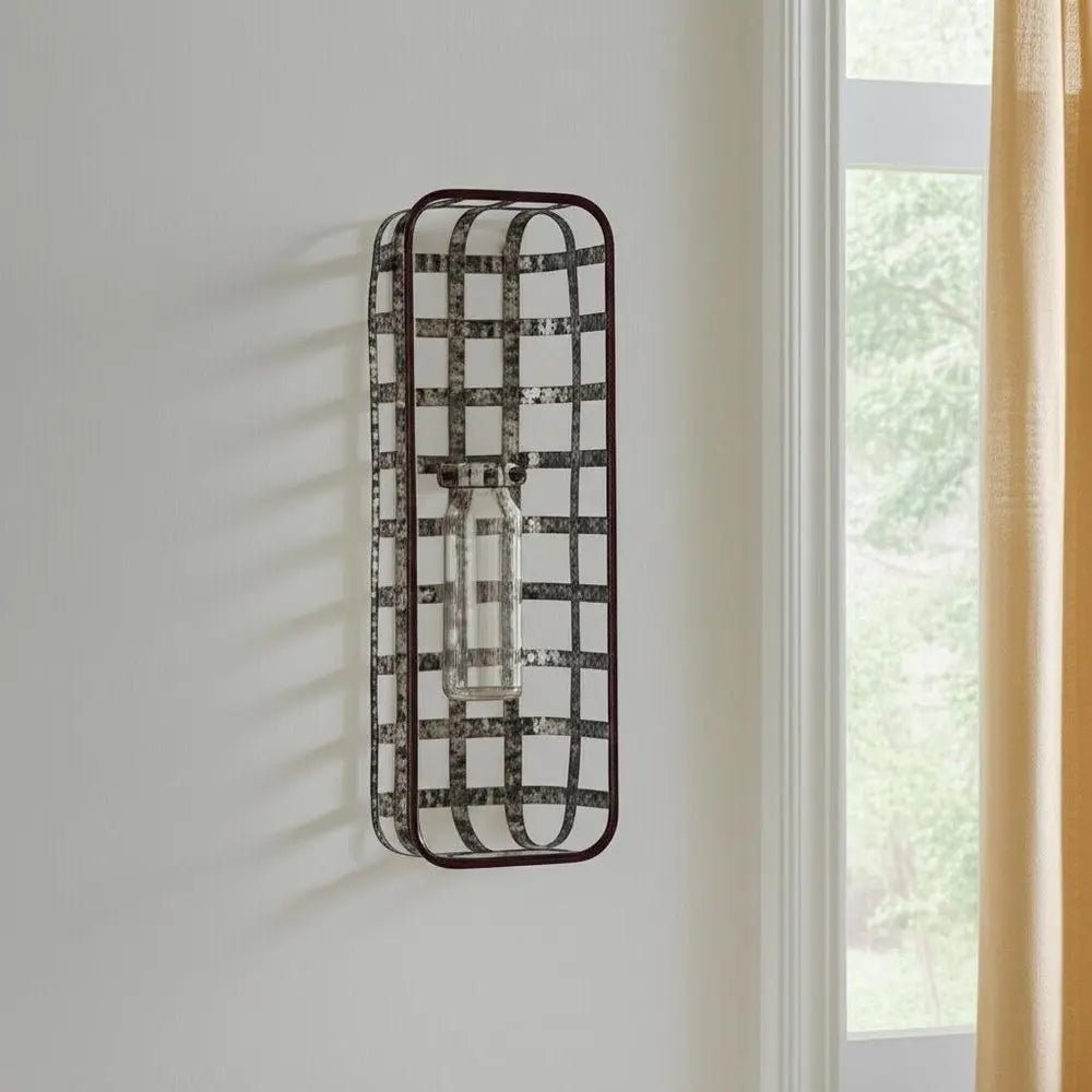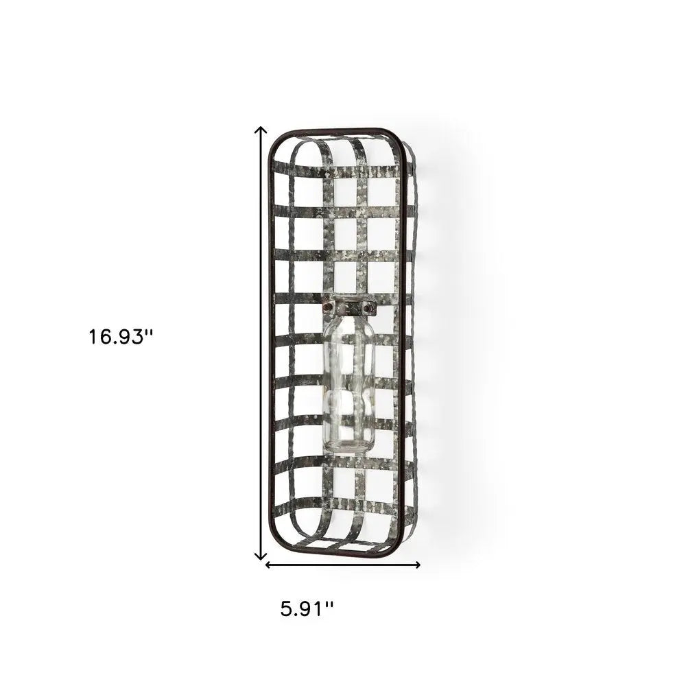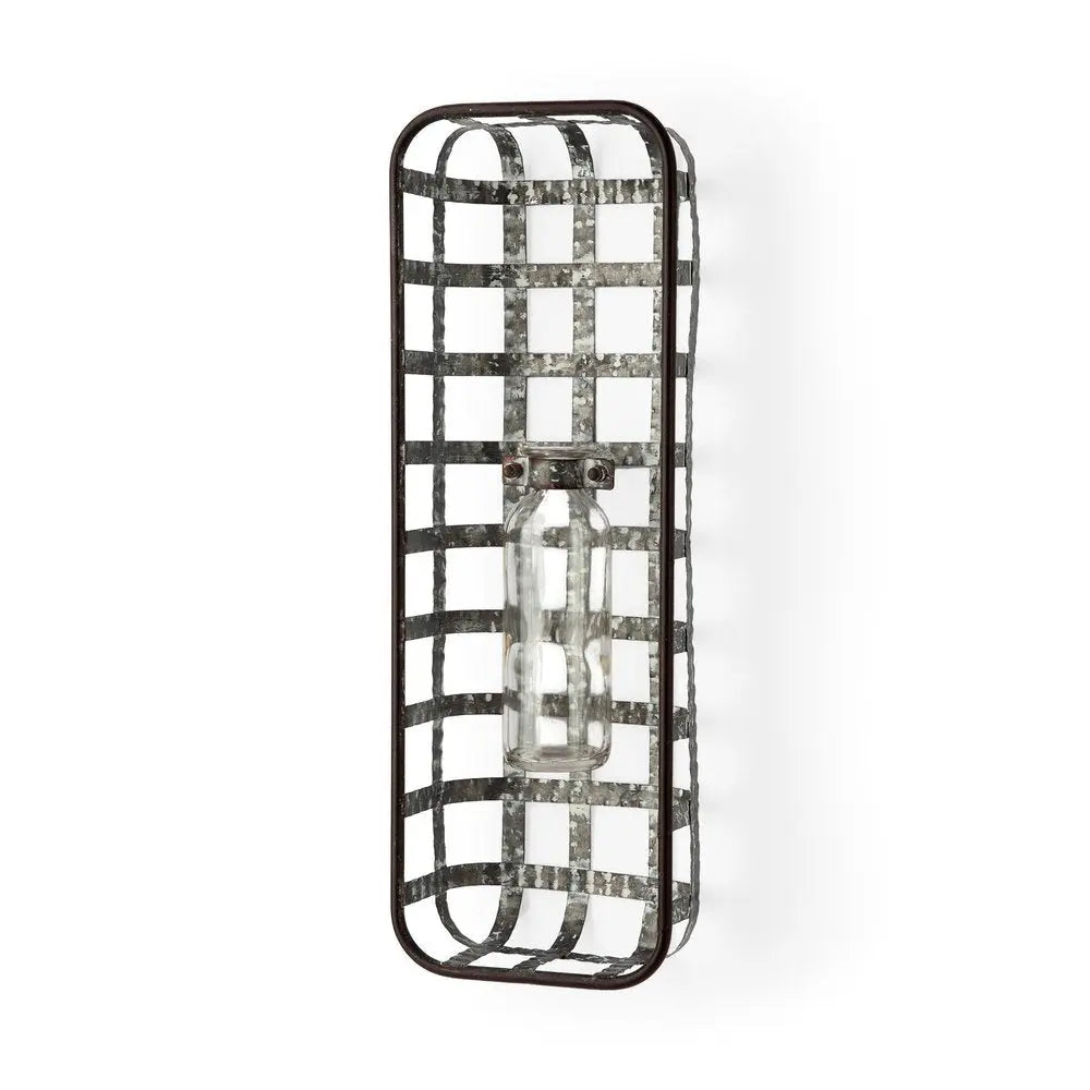17" Black And Clear Glass Bottle And Metal Wall Vase