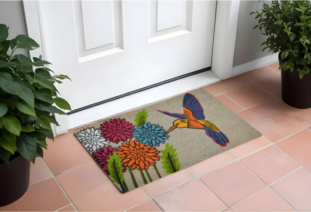Known for it's extreme durability and ability to withstand heavy foot traffic, this 18-inch x 30-inch brown and blue coir hummingbird and floral outdoor door mat is an ideal option for the front door or entrance way of your home or business. Crafted from coconut husks, this mat is not only functional but is an an eco-friendly and visually appealing accessory. The naturally bristled texture of coir is an efficient way to clean dirt and mud from shoes and is easy to clean and maintain. Add this decorative mat to create a practical yet inviting welcome to all who enter. 18-inch H x 30-inch W x 0.5-inch D