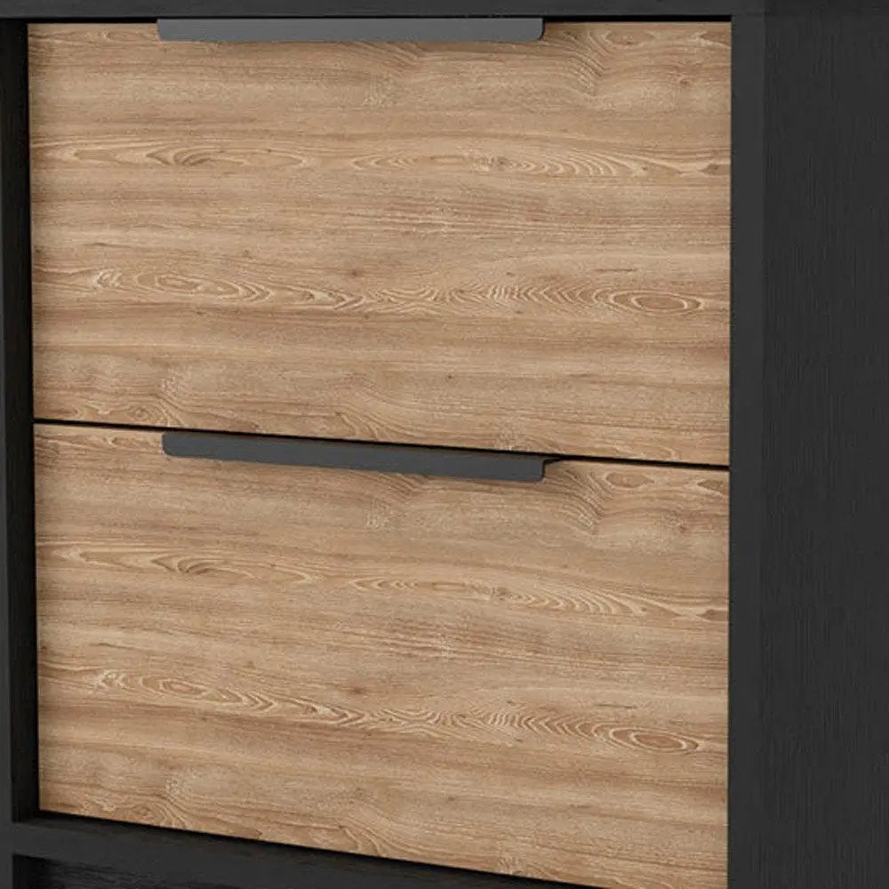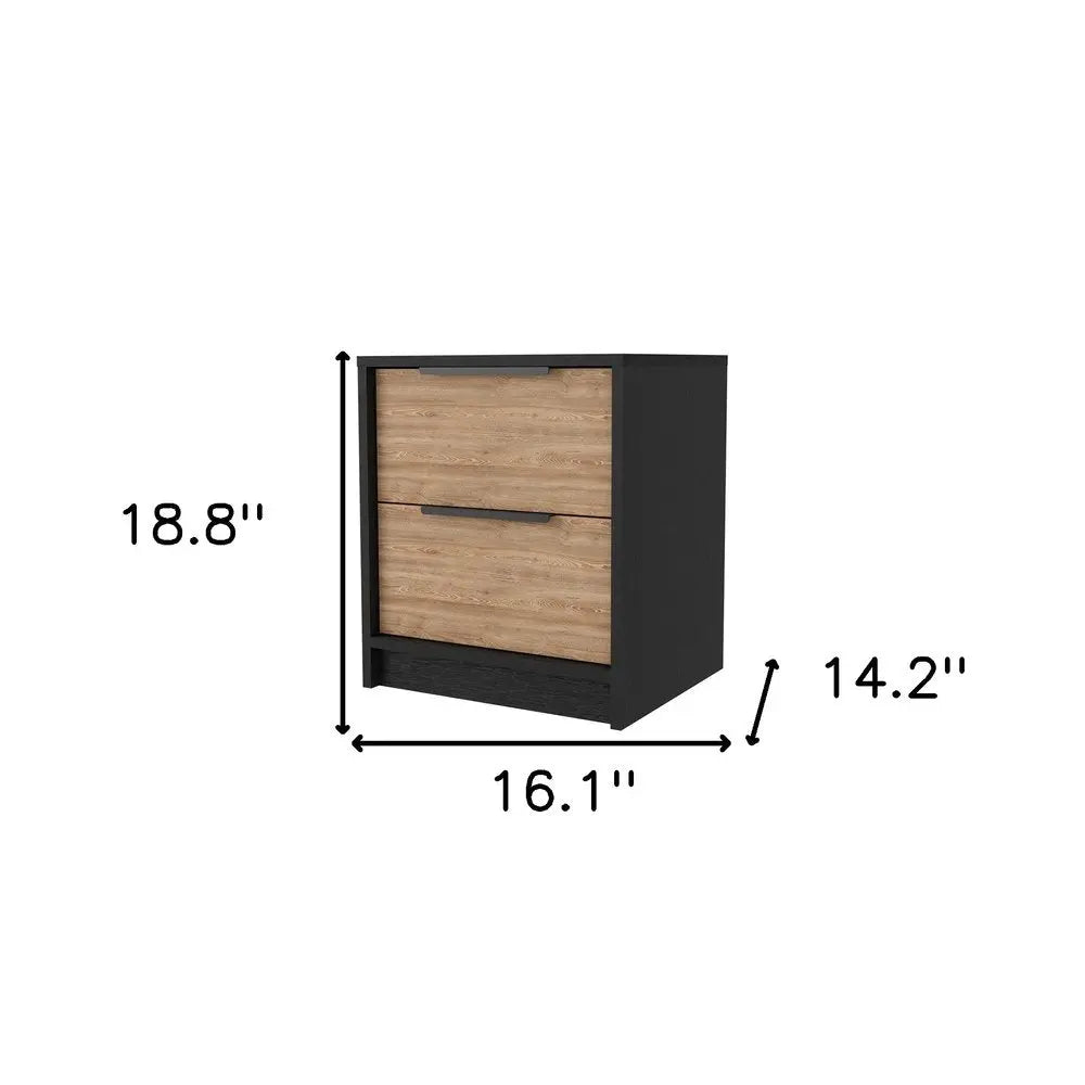 Give your room the look and feel of 5-star accommodations with this 19-inch black and natural wood two drawer nightstand. Made of high quality manufactured wood that is built to last. Includes 2 drawers to give you multiple storage options to keep clutter at bay. The unsung hero of the bedroom, this nightstand is perfect for keeping a glass of water, lamp, alarm clock, jewelry, and more, close by and easily accessible. Nightstands are obviously great beside the bed but can be used just as easily to help battle clutter in your living room, hallway, office, or dining room. 18.8-inch h x 16.1-inch w x 14.2-inch d.