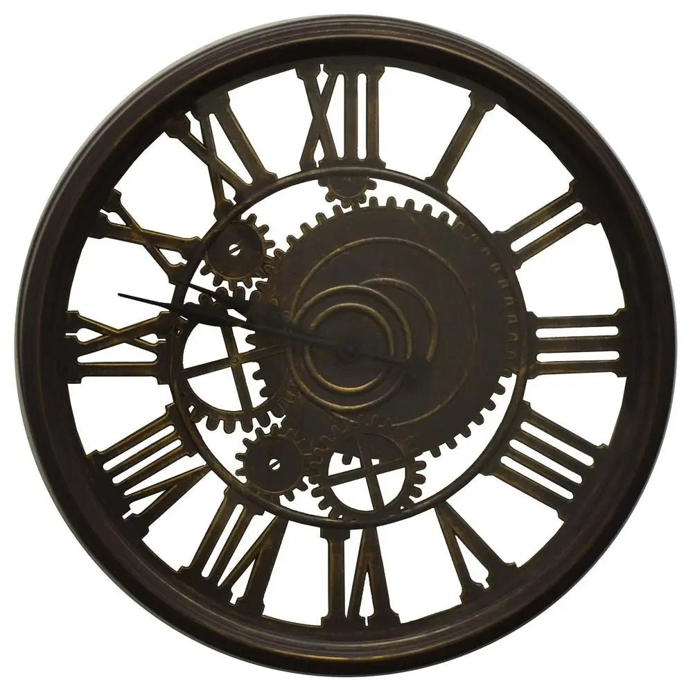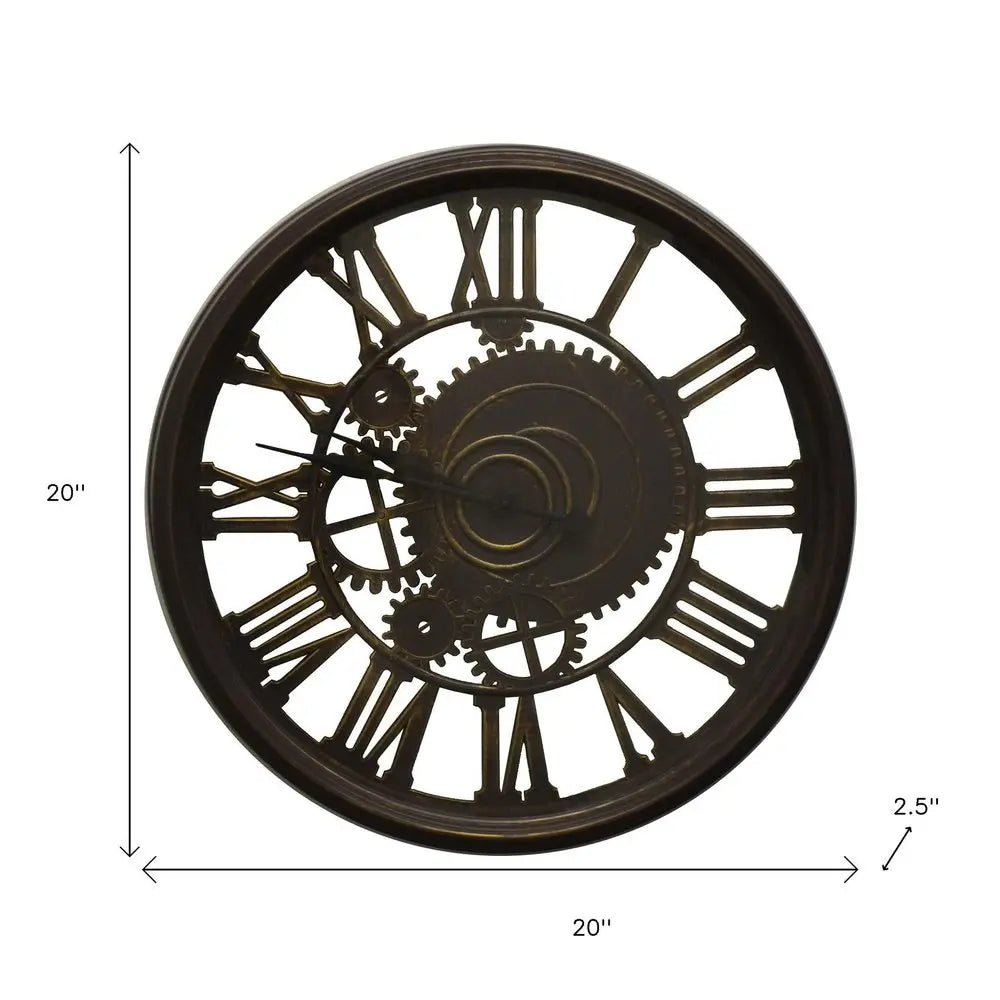 20" Antiqued Gold And Brown Heavy Duty Plastic Silent Skeleton Distressed Exposed Gear Round Wall Clock