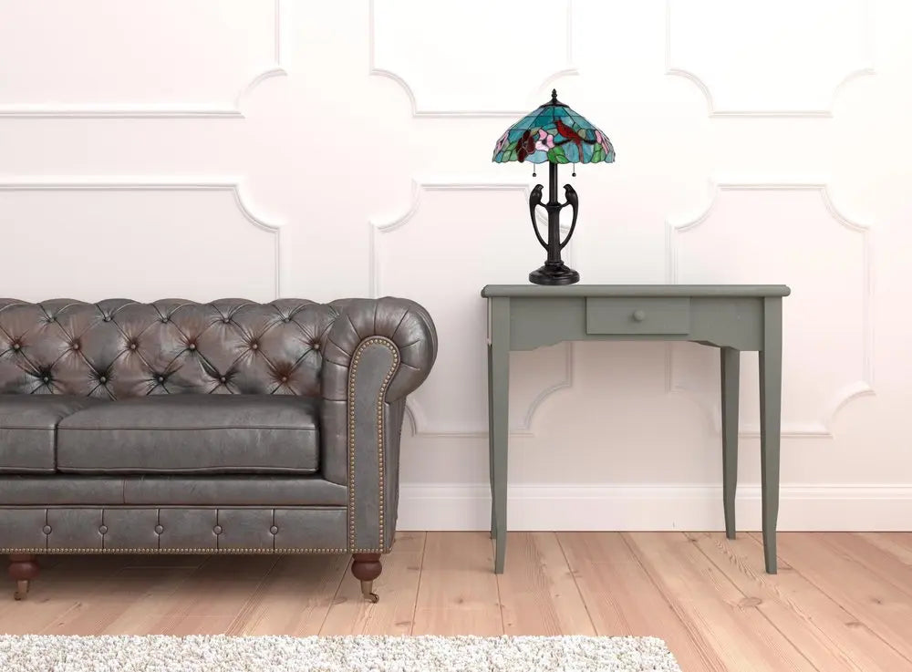 22" Bronze Two Light Tiffany Table Lamp With Aqua and Red Floral Shade