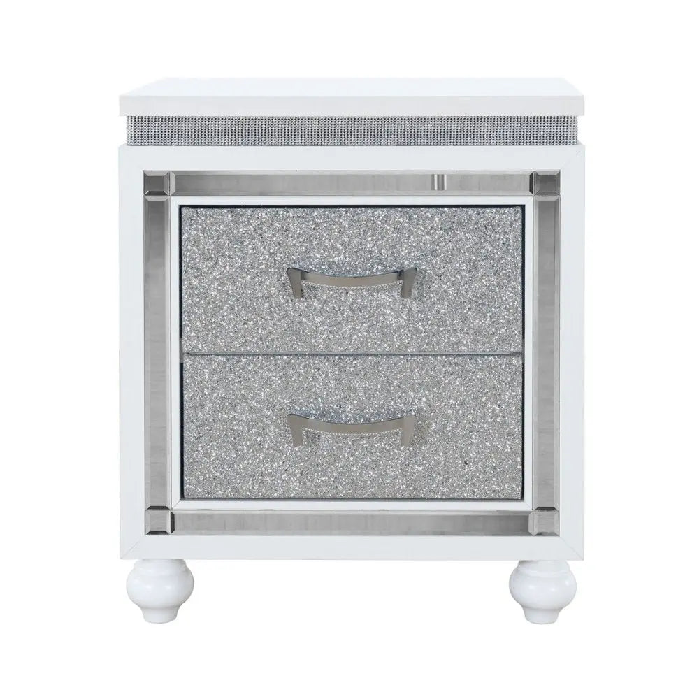 Give your room the look and feel of 5-star accommodations with this 22-inch white and silver two drawer faux crystal bling wood nightstand. Sturdy and durable construction from solid and manufactured wood ensures this trusty bedside table is built to last. This piece has 2 drawers for your storage needs. The unsung hero of the bedroom, this nightstand is perfect for keeping a glass of water, lamp, alarm clock, jewelry, and more, close by and easily accessible. Versatile in use this nightstand would also work as a great end table in the living room, hallway, or office. 21.65-inch h x 25.79-inch w x 16.14-inch d
