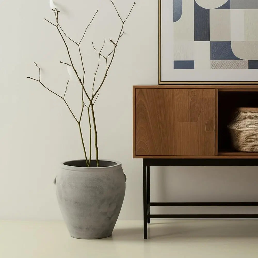 The 24-inch gray amphora ceramic floor vase is a stunning centerpiece that enhances any living space. Featuring a unique amphora shape, this vase adds a contemporary touch to your decor. Crafted from high-quality ceramic in a purposefully weathered and distressed concrete like finish, it showcases durability while maintaining an earthy artisanal aesthetic. Its modern style allows it to seamlessly integrate into various interior themes, whether placed in the living room, hallway, or entryway. With its striking gray color, this floor vase complements both vibrant and neutral color palettes effortlessly. Ideal for displaying fresh flowers or as a standalone piece, it elevates your home’s ambiance and serves as a conversation starter for guests. 24.41-inch h x 27.17-inch w x 15-inch d.