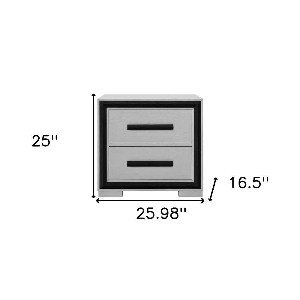 Good looking design and practical styling meet to form this 25-inch gray and black two drawer wood nightstand. Sturdy and durable construction from solid and manufactured wood ensures this trusty bedside table is built to last. The piece has 2 drawers to store your bedtime essentials close to you as you rest. The unsung hero of the bedroom, this nightstand is perfect for keeping a glass of water, lamp, alarm clock, jewelry, and more, close by and easily accessible. Versatile in use this nightstand would also work as a great end table in the living room, hallway, or office. 25-inch h x 25.98-inch w x 16.5-inch d