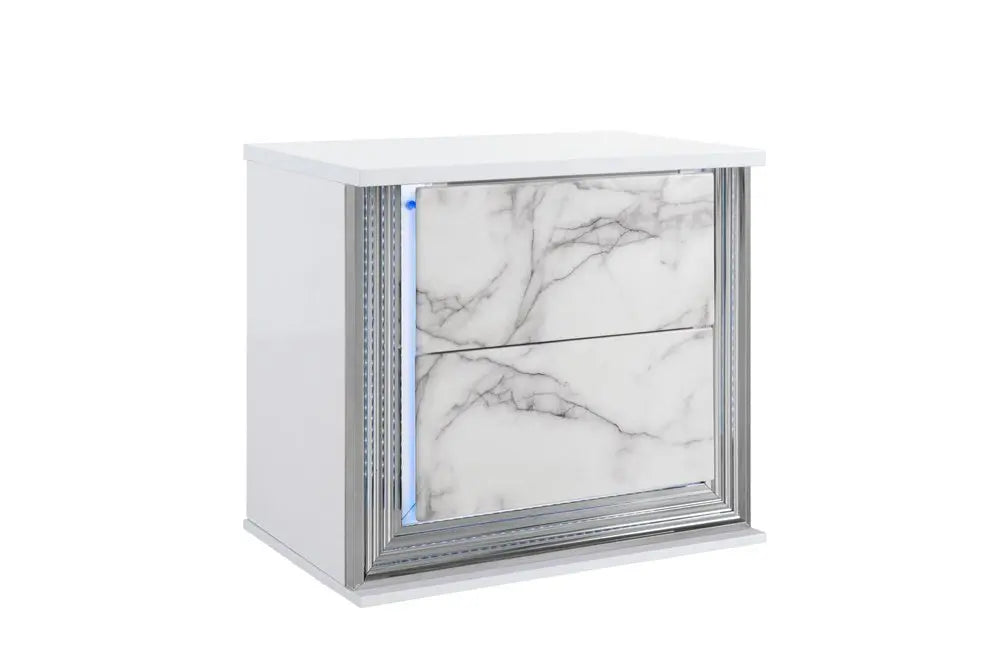 Our 25-inch white wood faux marble solid and manufactured wood lighted two drawer nightstand with usb port will compliment your bed beautifully. Robust in design, the bed side table has been expertly crafted from wood and faux marble. Includes 2 drawers to give you multiple storage options to keep clutter at bay. The unsung hero of the bedroom, this nightstand is perfect for keeping a glass of water, lamp, alarm clock, jewelry, and more, close by and easily accessible. Versatile in use this nightstand would also work as a great end table in the living room, hallway, or office. 24.65-inch h x 27.17-inch w x 17.13-inch d.