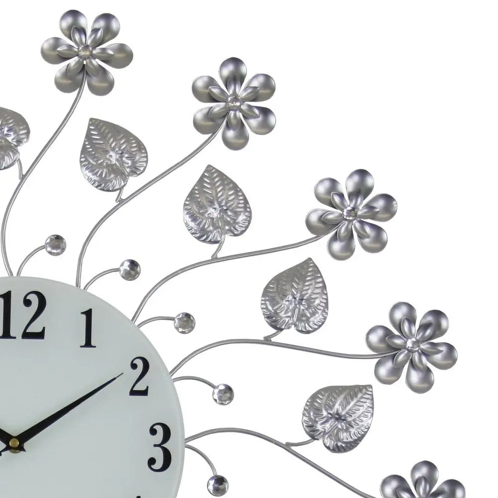 27" Silver White And Black Metal and Glass Silent Analog Floral Round Wall Clock