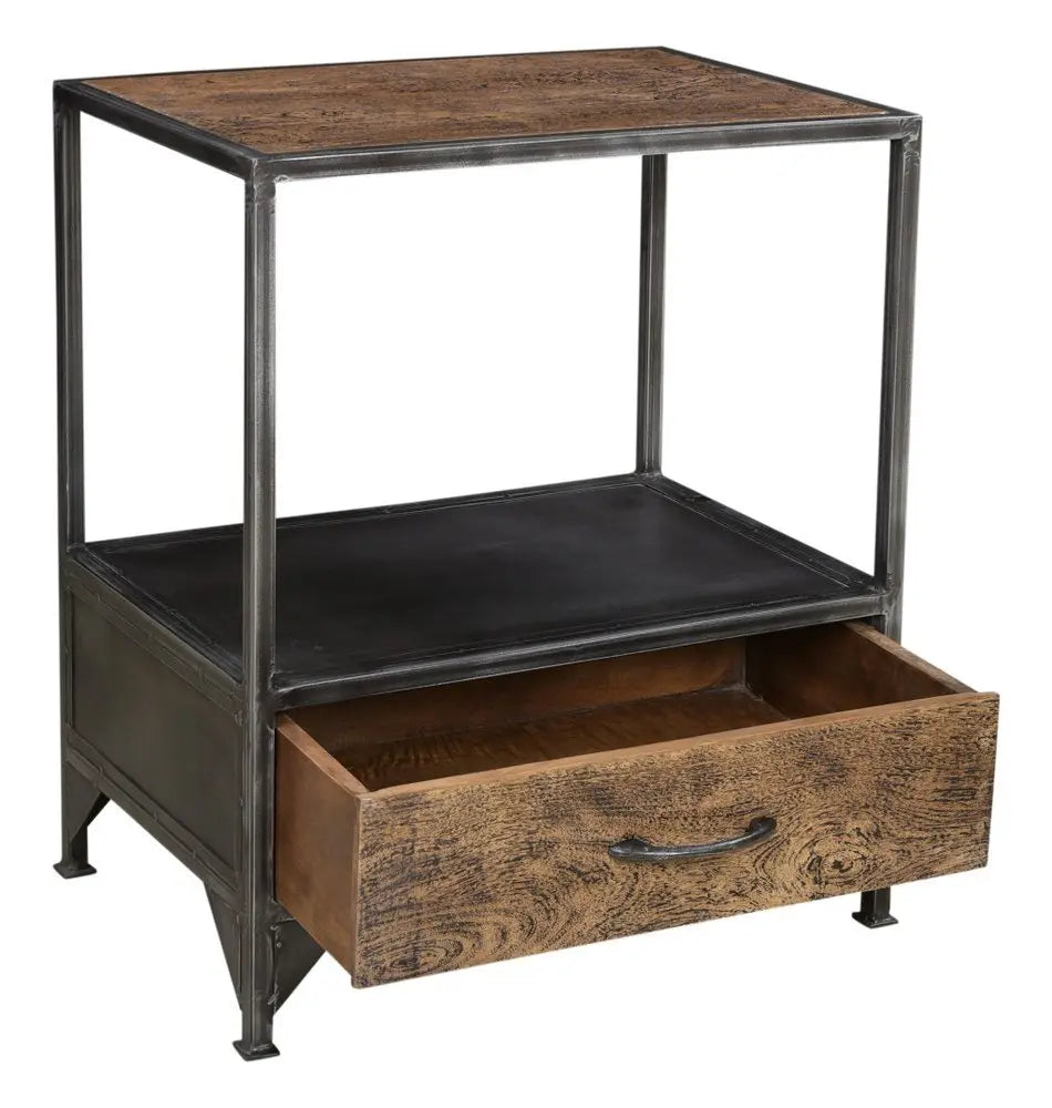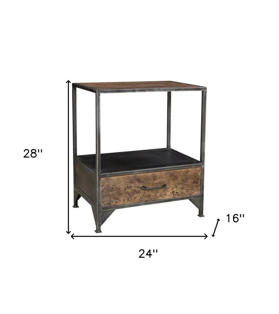 28" Brown And Dark Gray Steel and Solid Wood Distressed One Drawer Nightstand