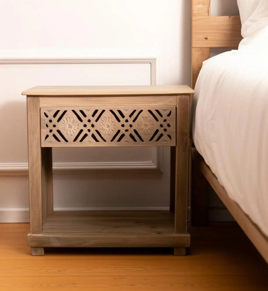 28" Natural Solid Wood Carved Geometric One Drawer Nightstand