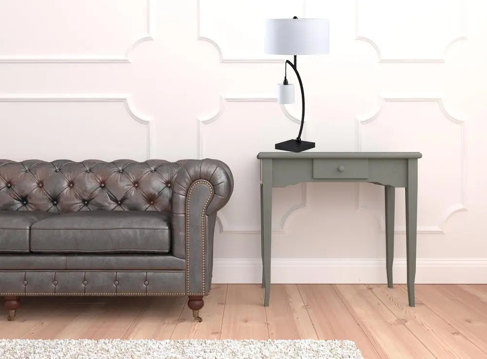 29" Black Metal Two Light Arched Table Lamp With White Drum Shade