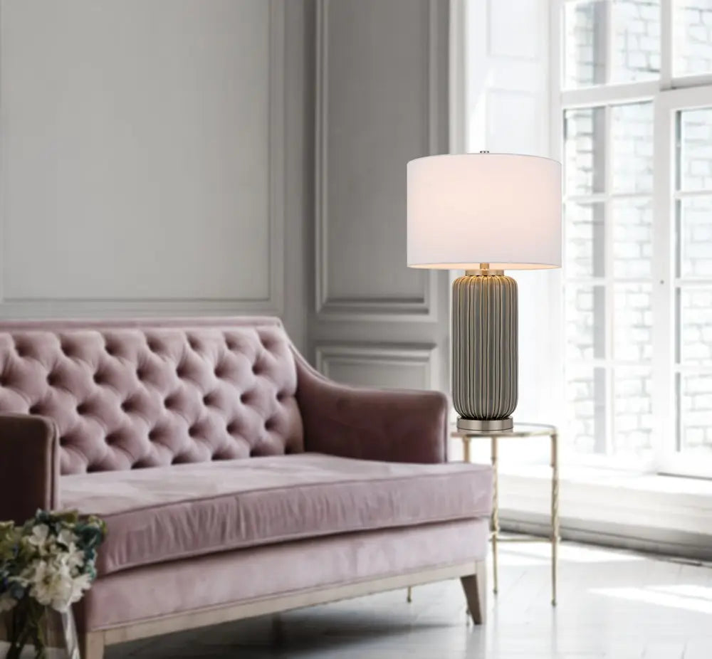 29" Gray Metal Cylinder Table Lamp With White Drum Shade