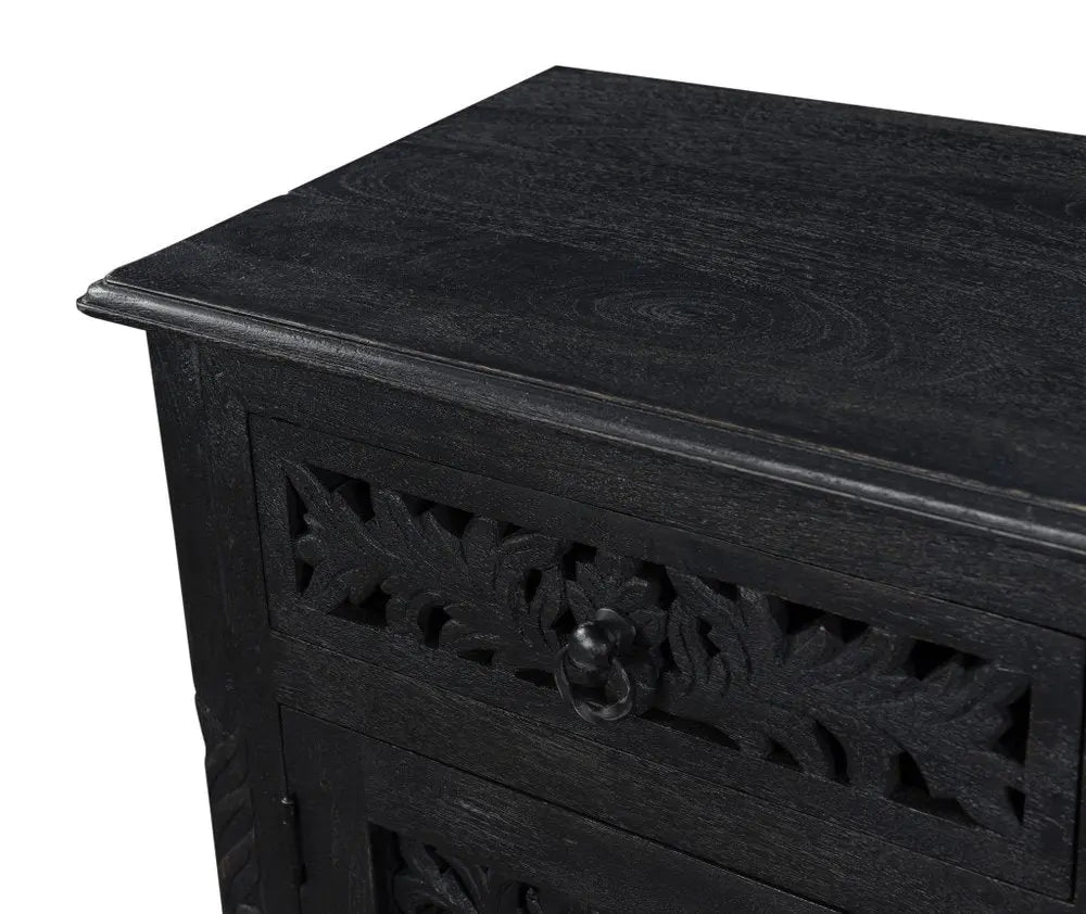 Our 30-inch black solid wood distressed one drawer nightstand will compliment your bed beautifully. Robust in design, the bed side table has been expertly crafted from solid wood. The easy open drawer allows you hidden storage to keep your essentials close at hand. An easy-access shelf gives you additional storage and display space. This piece is purposefully distressed to give a worn, rustic/vintage finish. The unsung hero of the bedroom, this nightstand is perfect for keeping a glass of water, lamp, alarm clock, jewelry, and more, close by and easily accessible. Look no further than this nightstand to accommodate all your needs and upgrade the style of your bedroom. 30-inch h x 22-inch w x 15-inch d.