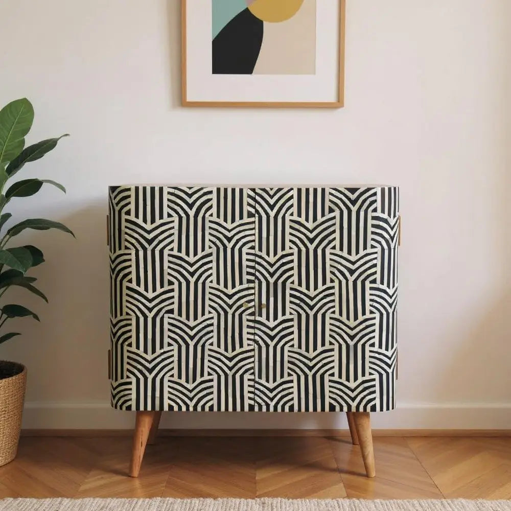 32" Dark Brown Black and White Solid Wood And Inlaid Bone Textured Accent Cabinet With Two Doors