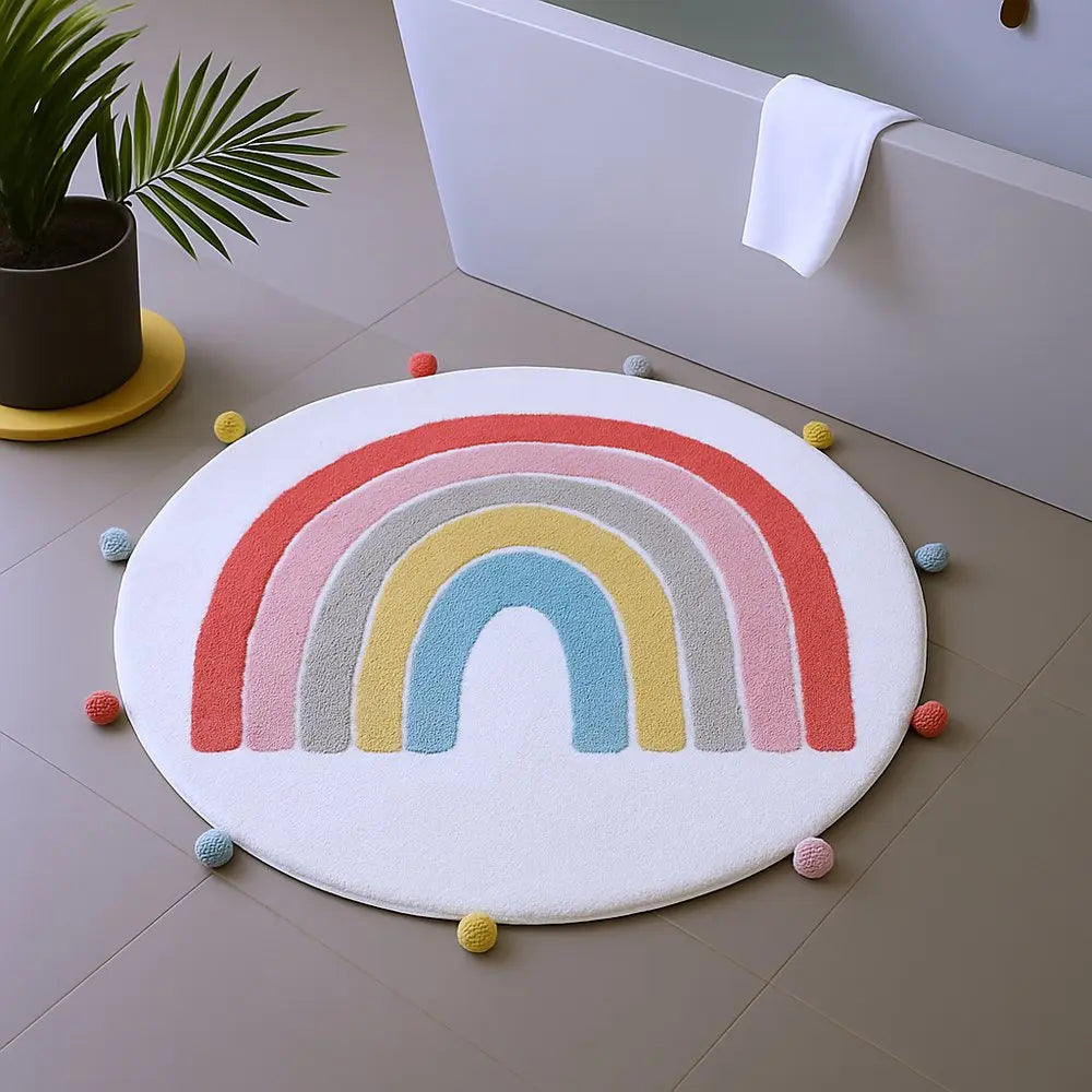 32" White Pink And Yellow Cotton Rainbows Round Youthful Bath Rug
