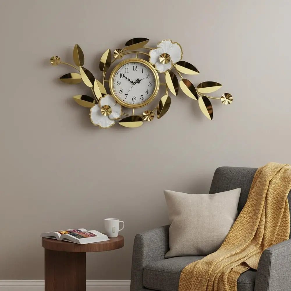 40" Gold And White Metal Silent Analog Floral Novelty Wall Clock