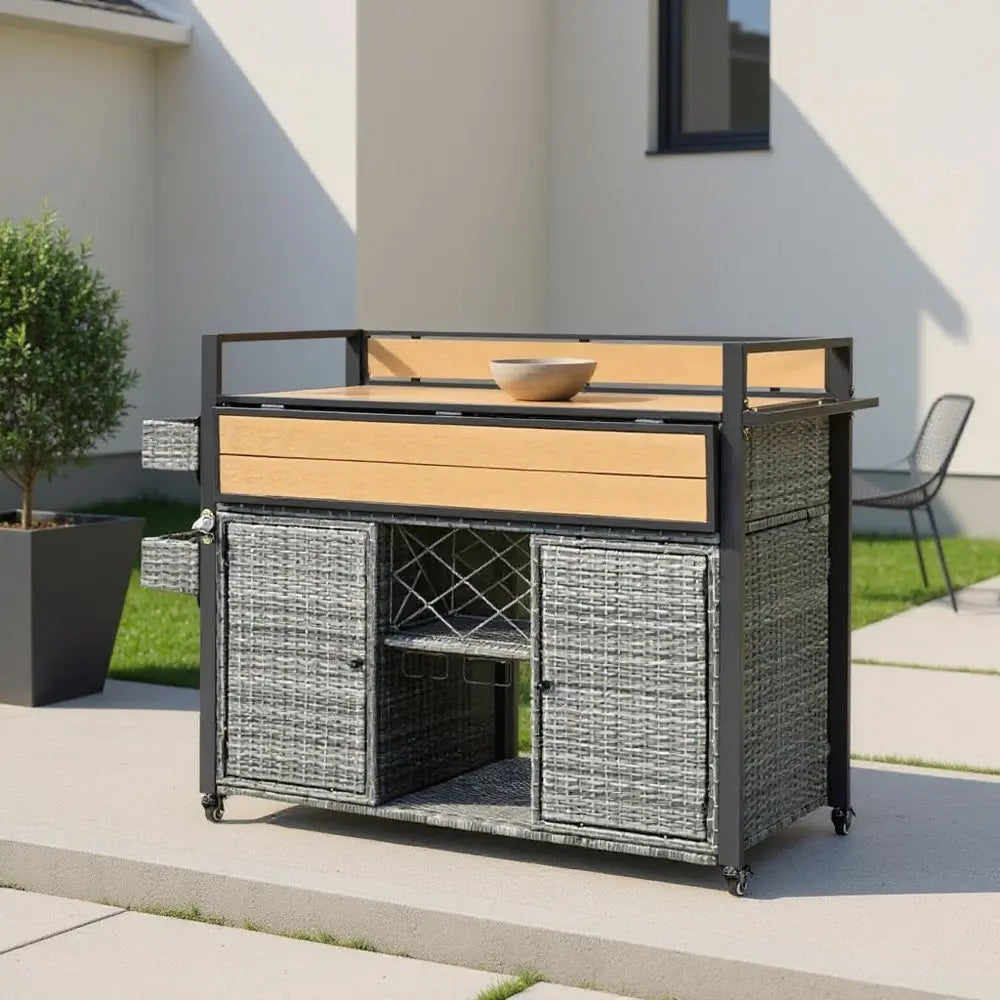53" Gray Wood and Metal Barn Door Rolling Kitchen Island With Storage