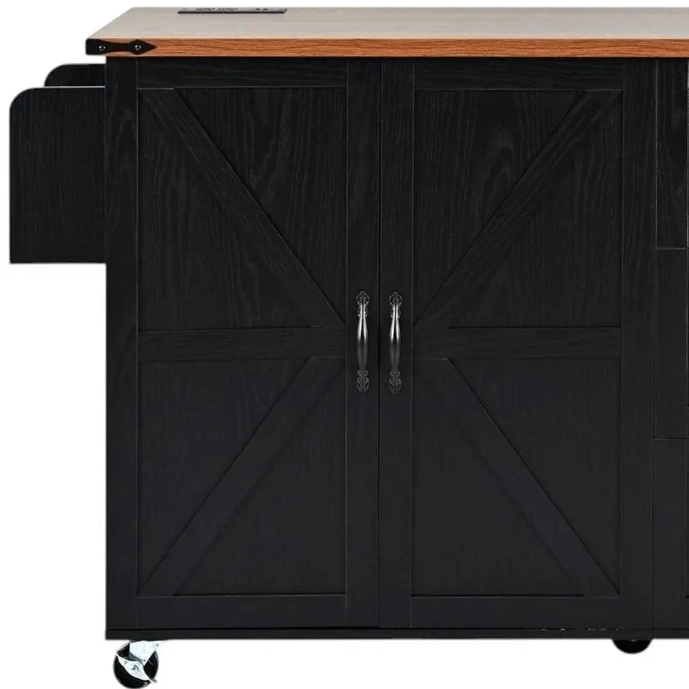 55" Black Wood Barn Door Rolling Kitchen Island With USB