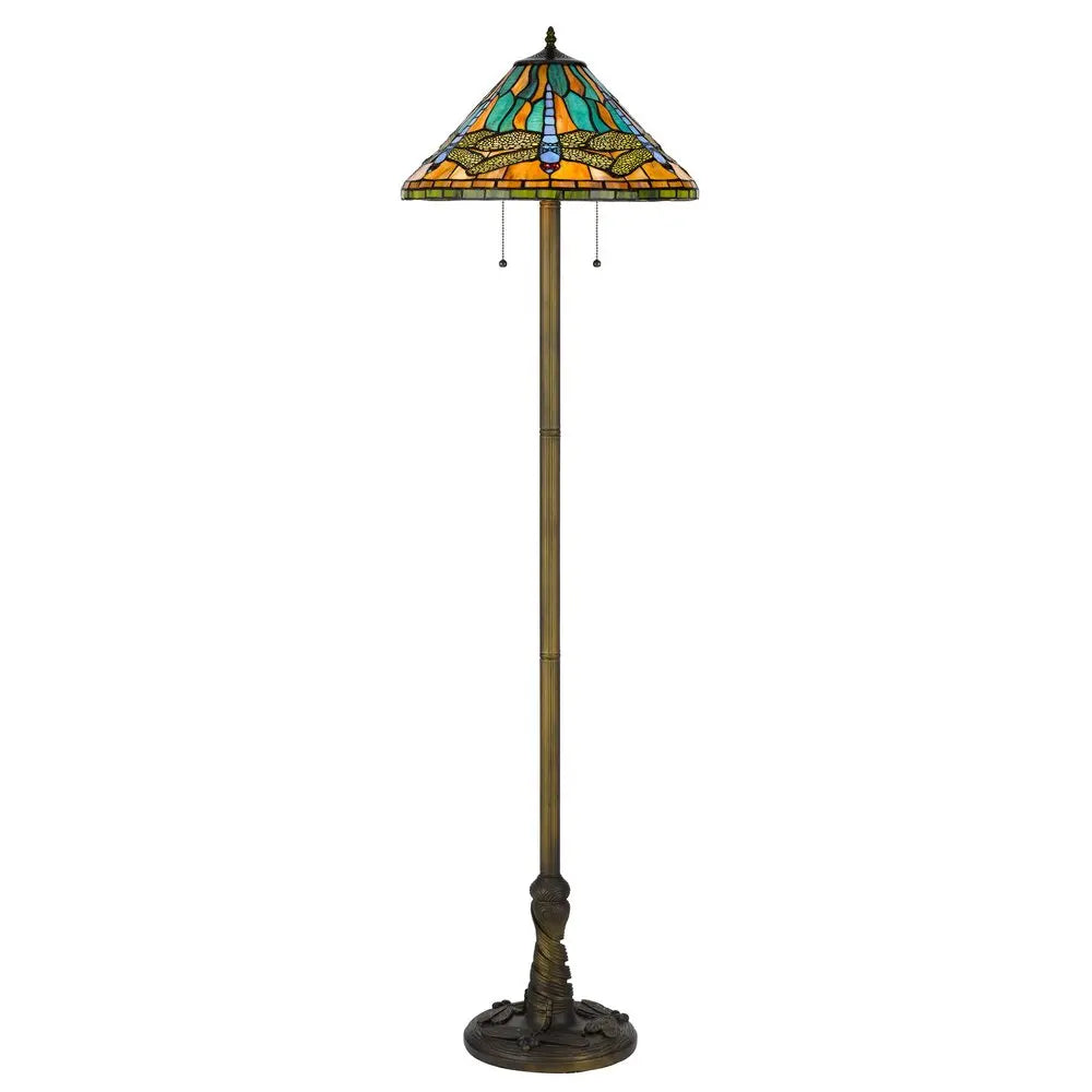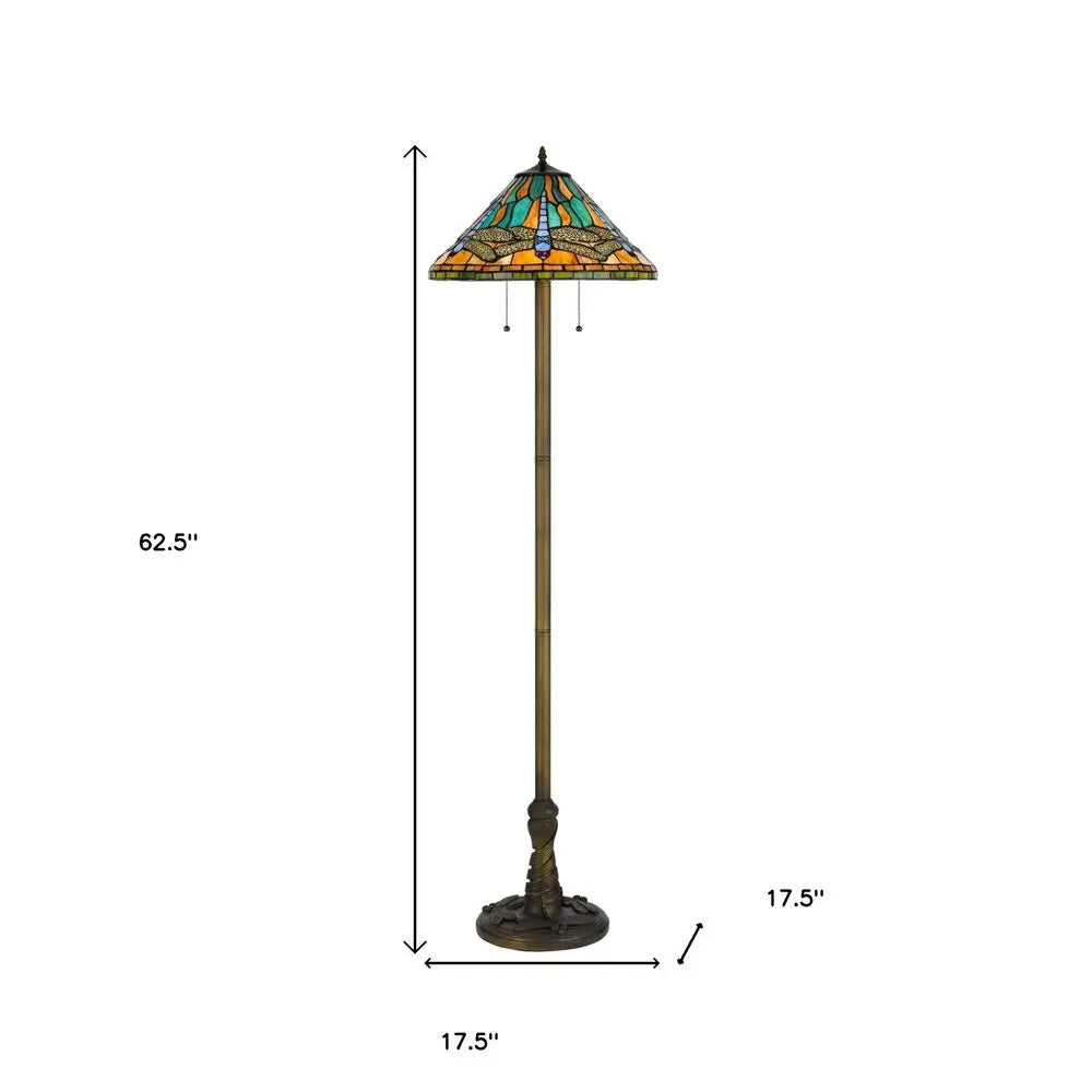 63" Brass Two Light Traditional Shaped Floor Lamp With Blue and Orange Dragonfly Tiffany Glass Empire Shade