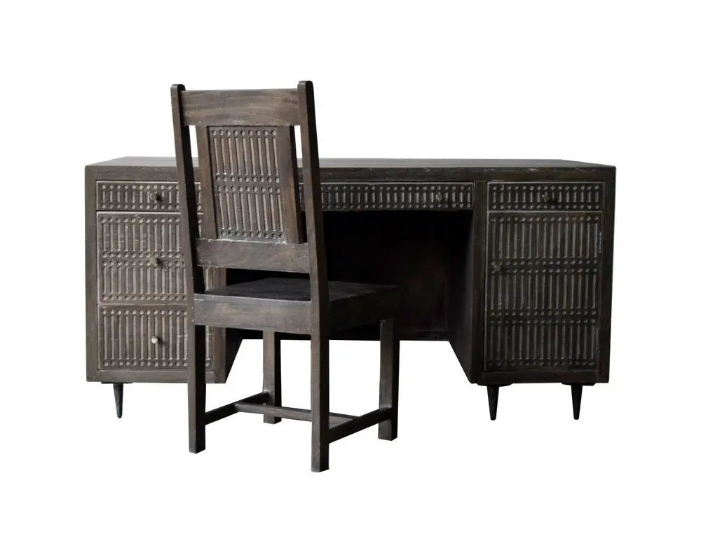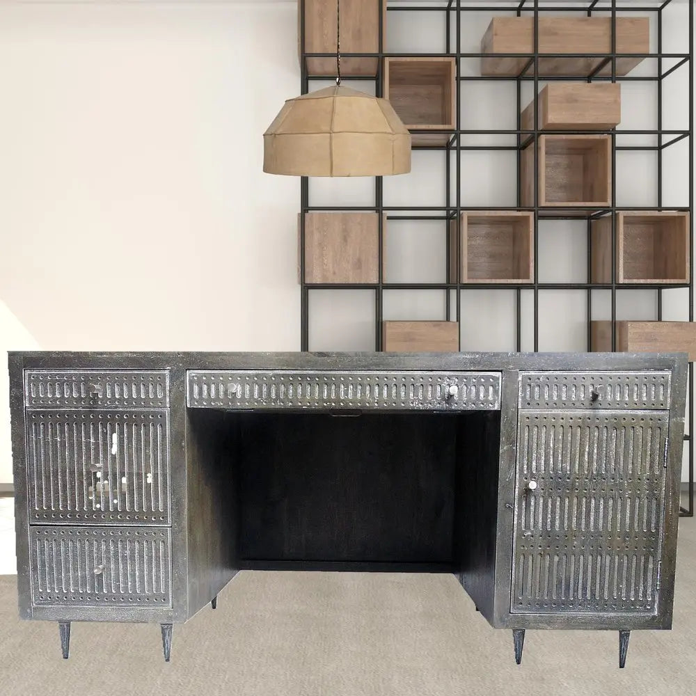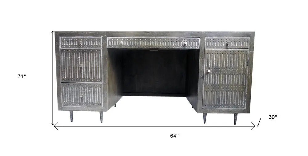 64" Brown and Silver Solid Wood Executive Desk With Five Drawers