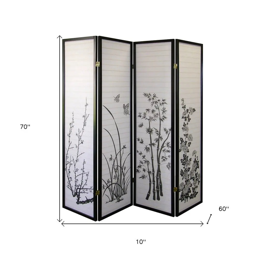 70" Black And White Heavy Duty Rice Paper Folding Four Panel Screen Room Divider HomeRoots