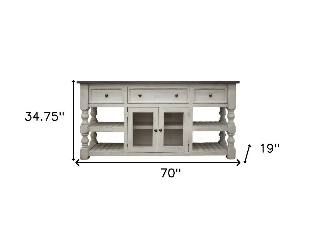 Ready to be enjoyed in your living room, family room, or recreation room, this 70" ivory solid wood open shelving distressed tv stand is a practical and good looking piece of furniture that will help to anchor your room. Curated from high quality solid pine wood, this console is natural, beautiful, and built to last. Due to the genuine nature of the wood some natural wood knots, and grain and color variations may occur. A To add to the versatility, this piece features open non-concealed storage that can be used for not only storage but display as well. Built-in cable and wire management helps to keep those unseamly wires at bay. Convert your room into a special place with your favorite collectibles and TV accessories that is suitable for living room, bedroom, or office. 34.75" H x 70" W x 19" D