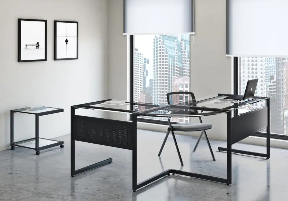 78" Clear and Black Glass and Metal Corner Computer Desk
