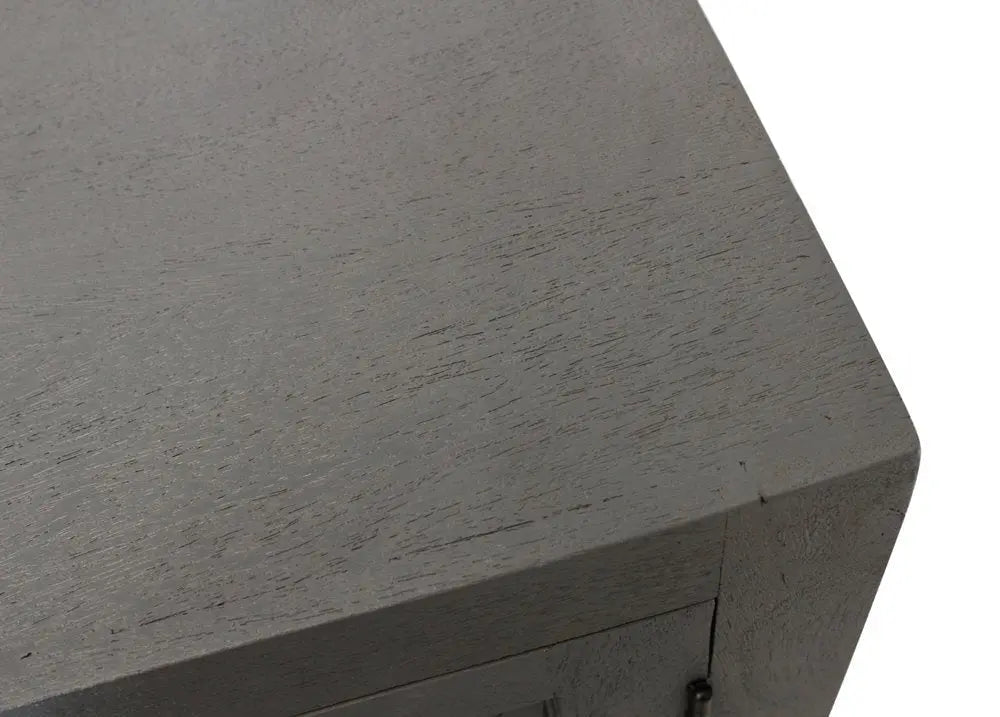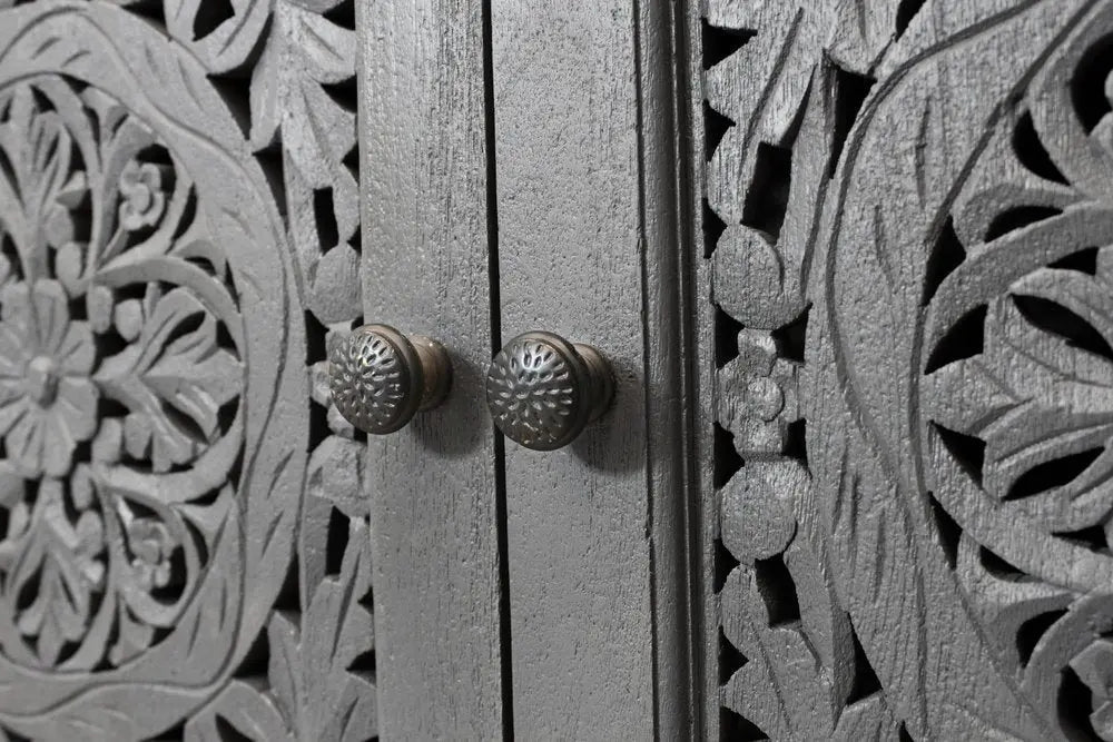 86" Dark Gray Carved Floral Distressed Solid Wood Enclosed Storage TV Stand