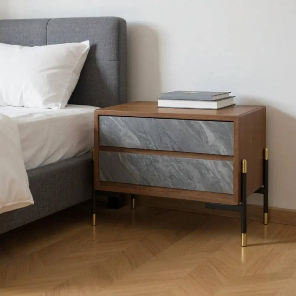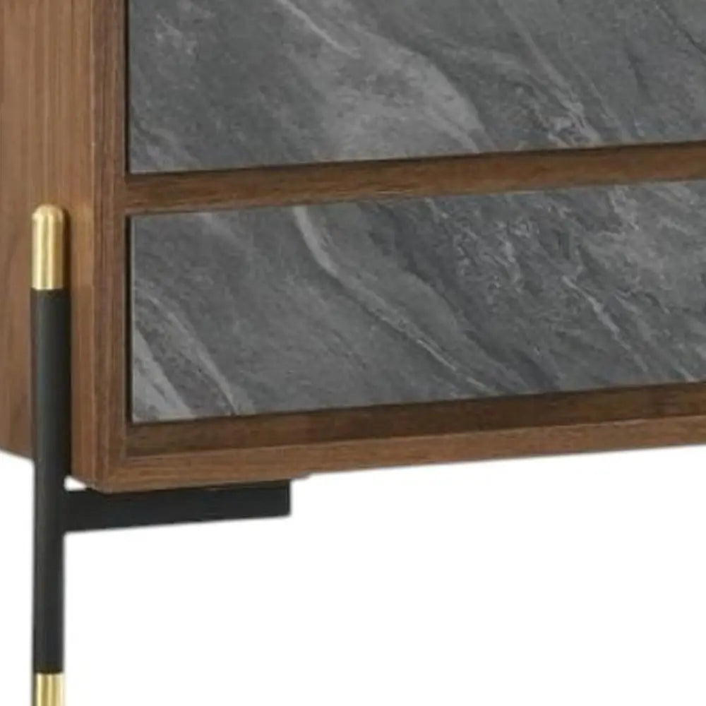 Mid Century Walnut and Gray Faux Marble Two Drawer Nightstand