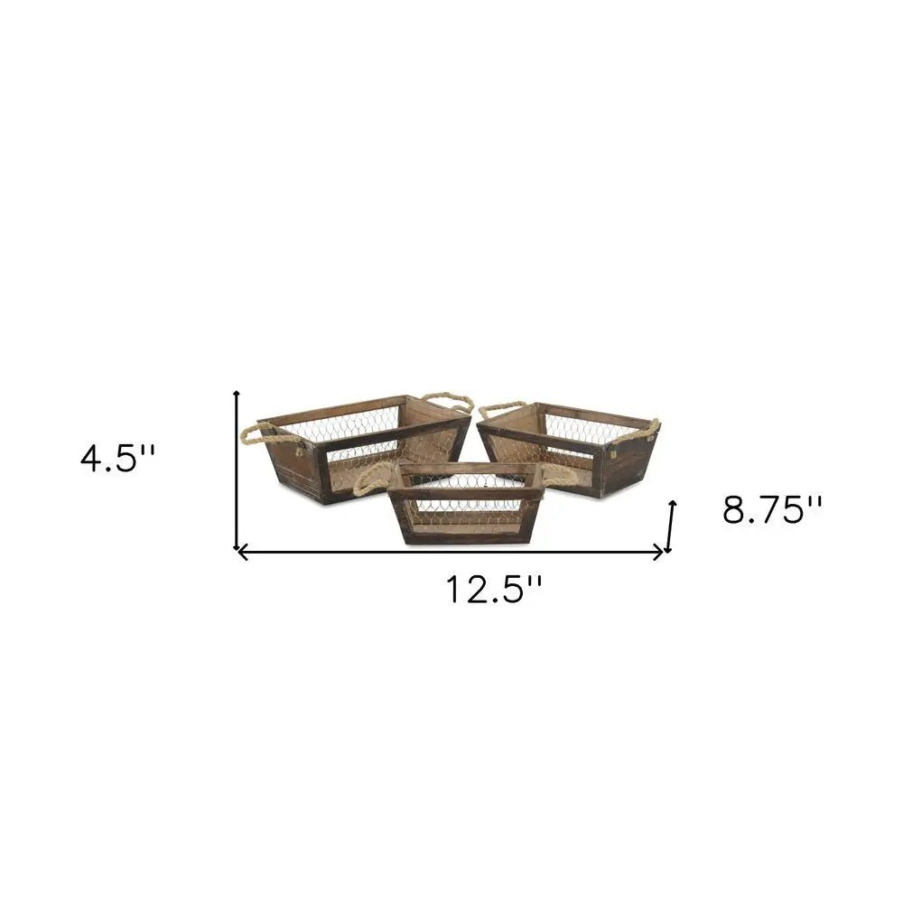 Set of Three Dark Brown Solid Wood And Metal Crate
