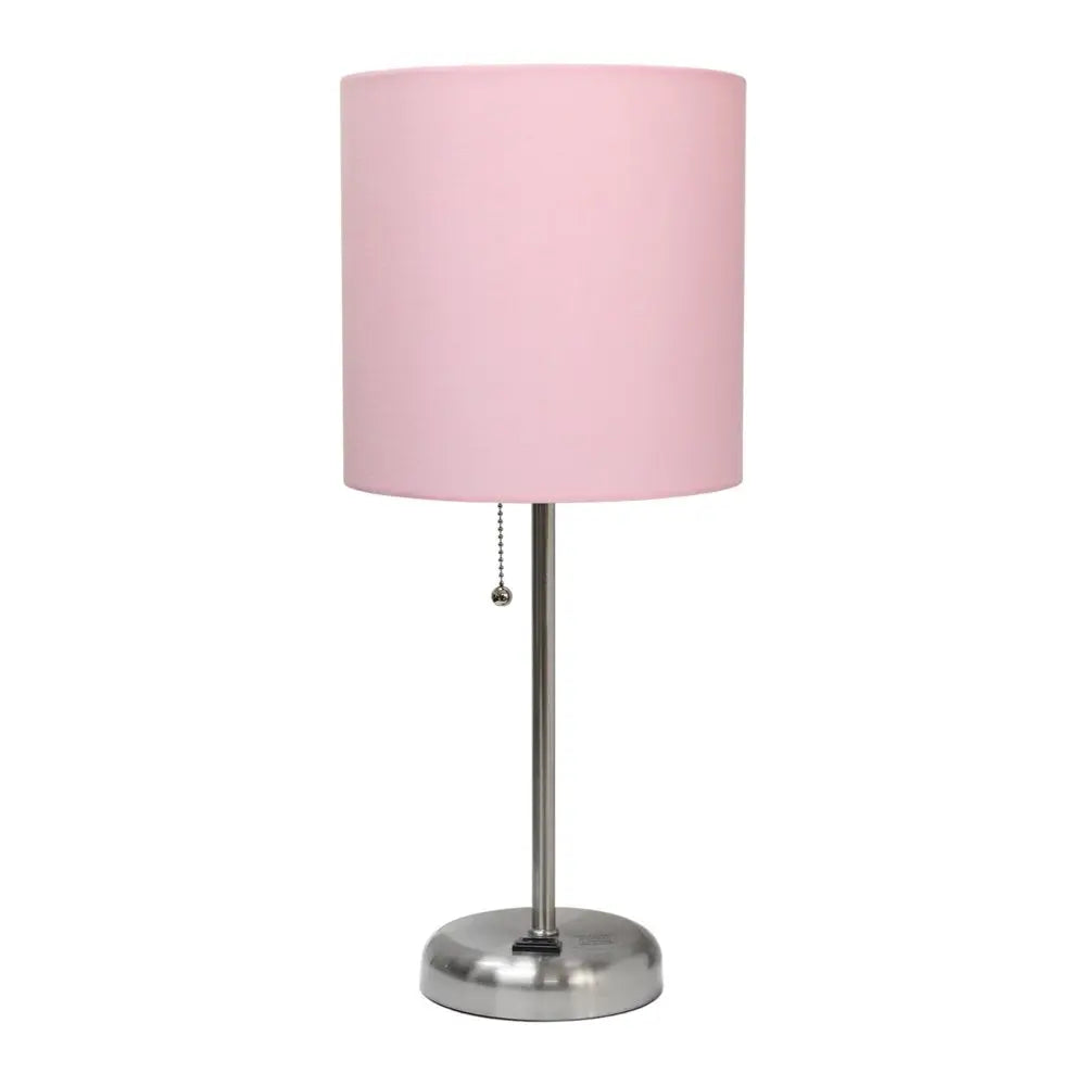 Set of Two 20" Silver Metal Table Lamp With Light Pink Drum Shade