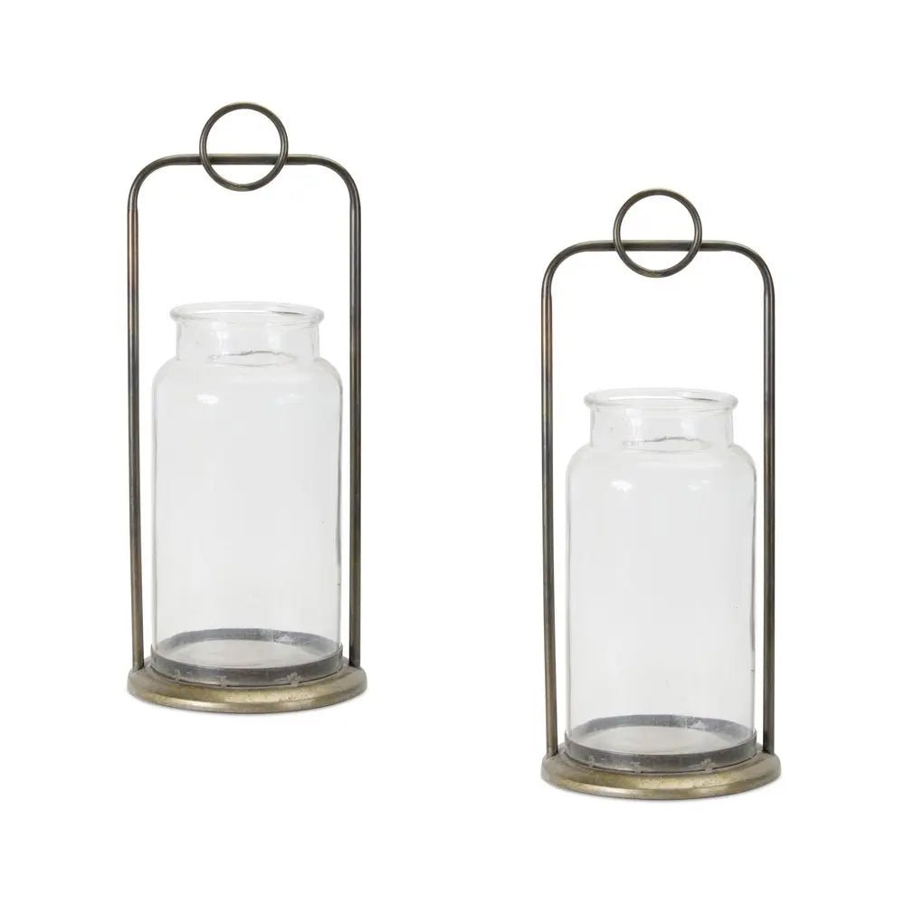 Set of Two Bronze Metal And Glass Tabletop Hurricane Candle Holders HomeRoots
