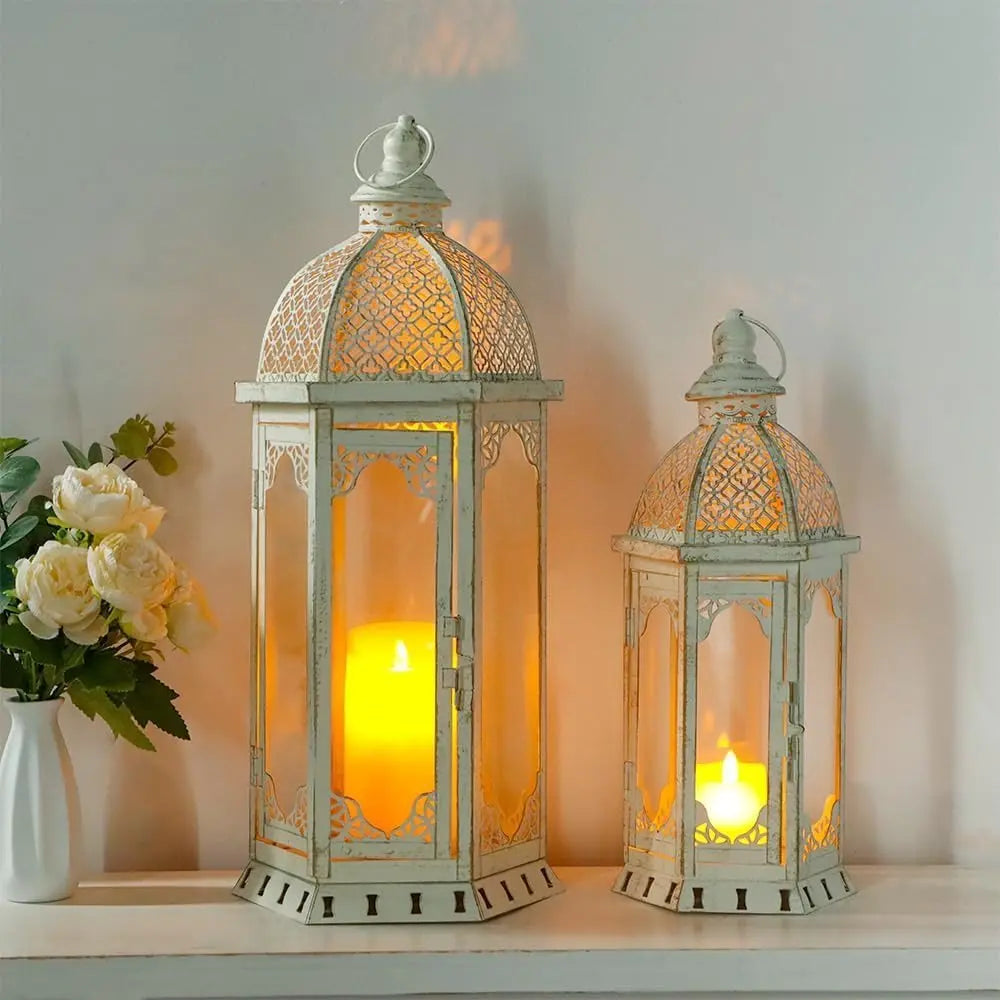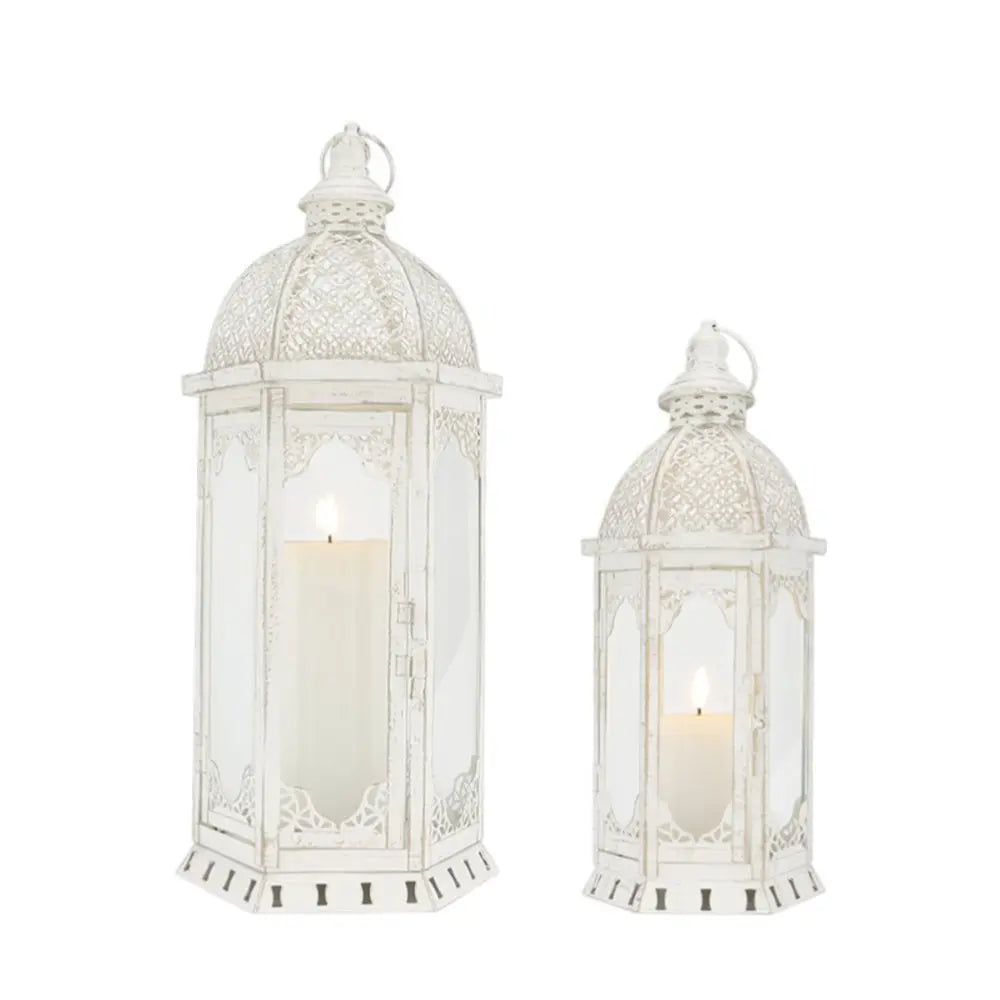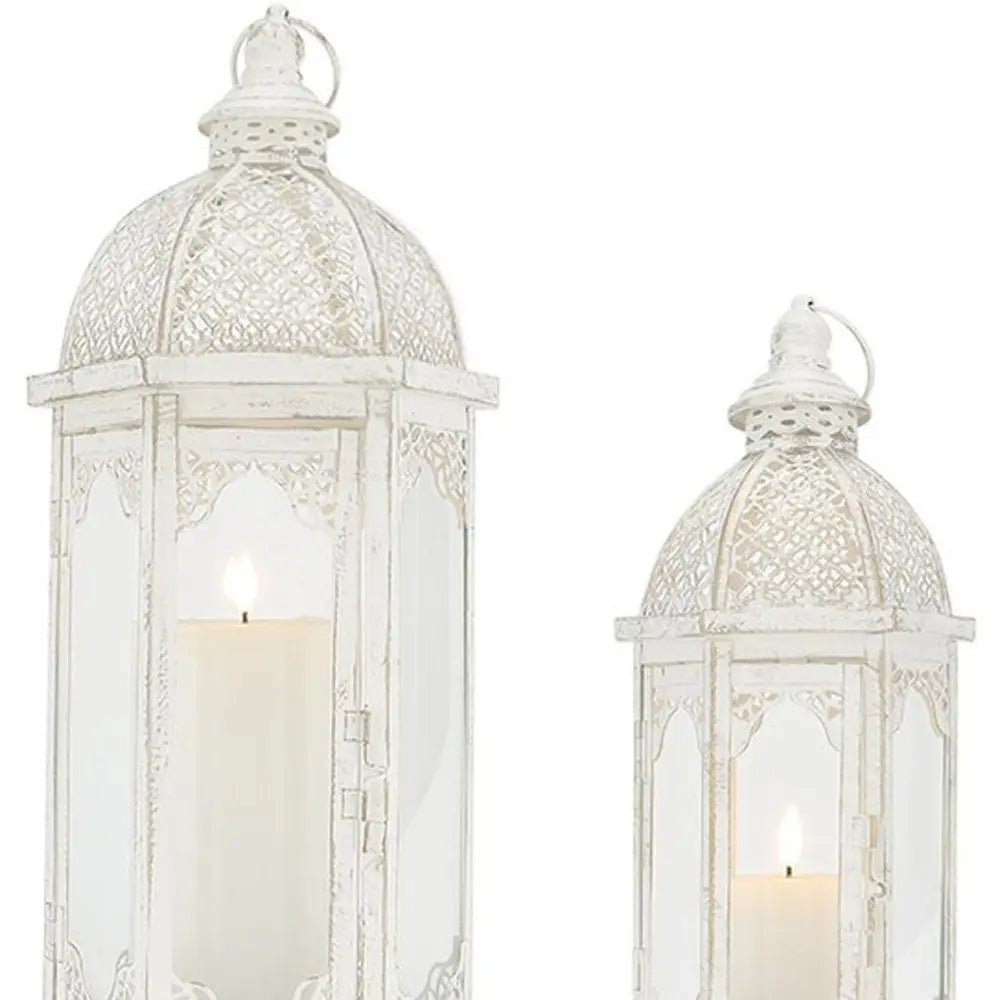 Set of Two White Distressed Ornate Metal Tabletop Lantern Candle Holders