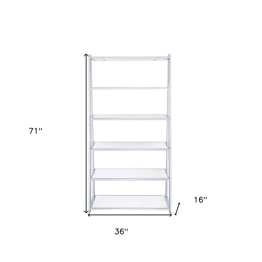 White And Silver Metal and Glass Five Tier Ladder Bookcase